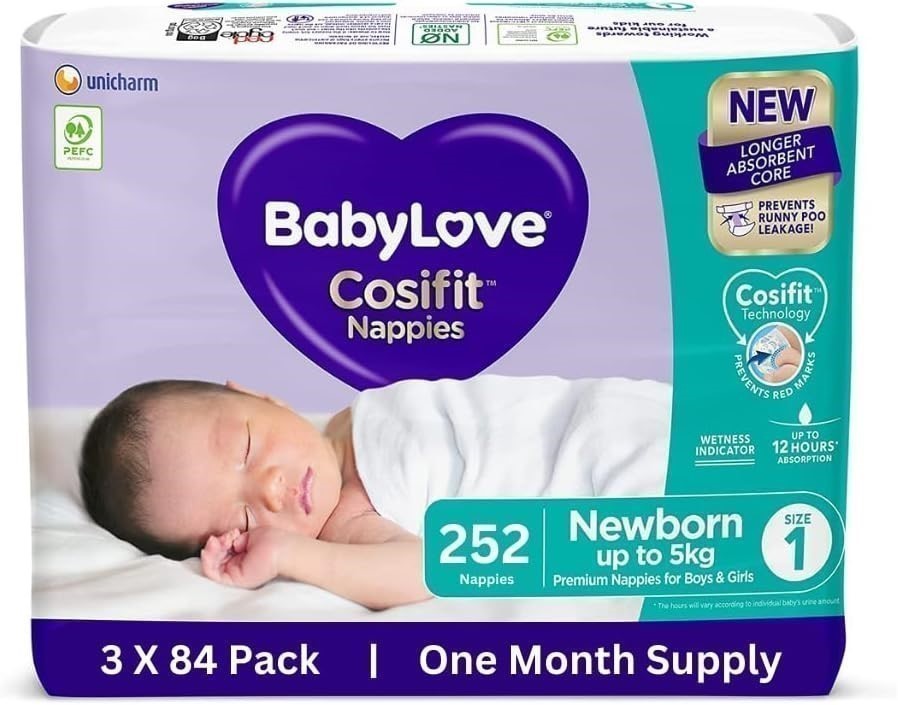 BABYLOVE Cosifit Newborn Nappies Size 1 (up to 5kg), 252 Pieces (3 X 84 Pac