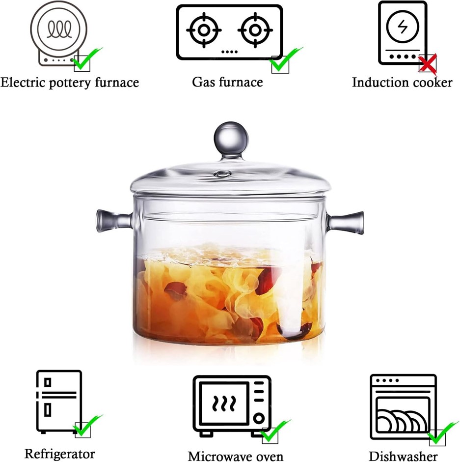 AEFPOYMXU Glass Pot for Cooking with Lid, 1.5L. NB: Minor use, Minor stain Lot No: 0133-5061921 |