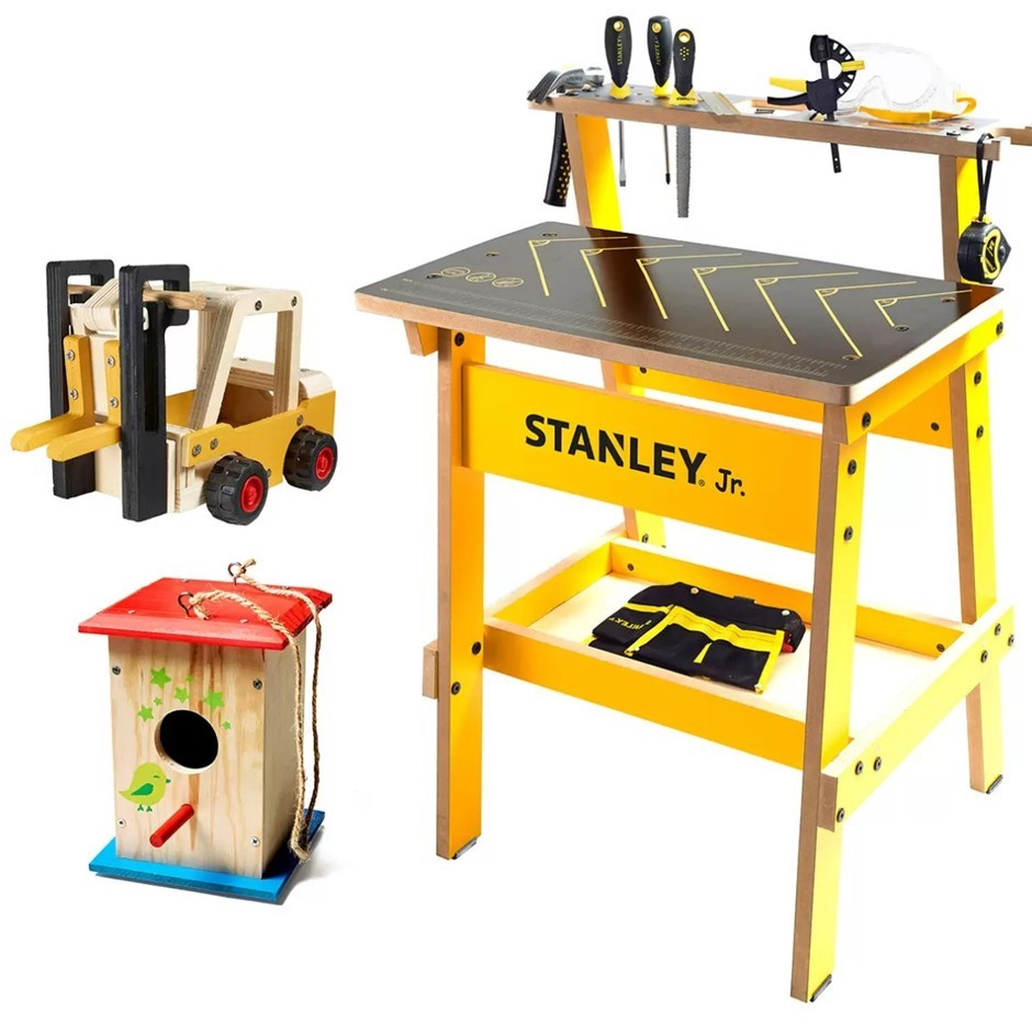 STANLEY JR Kids Workbench w/ Wood Kits. NB: Damaged packaging, some pieces