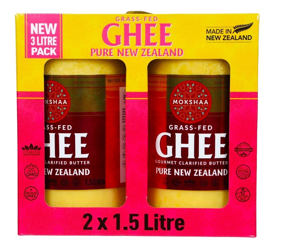 Box of 2 MOKSHAA Grass-Fed Ghee, 1.5L. Best Before: 10/2026.