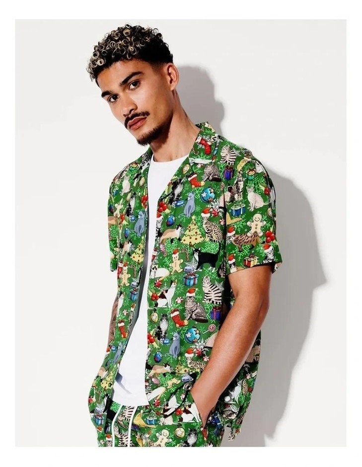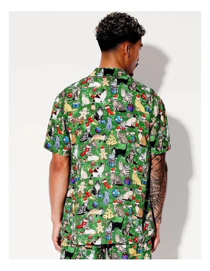 KENJI Christmas Cartoon Cat Print Short Sleeve Rayon Shirt. Size: XL. Colou