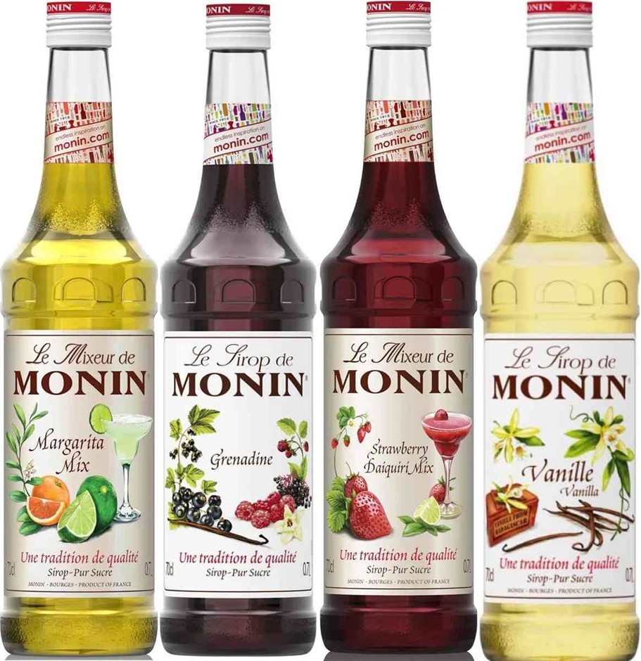 4 x MONIN SYRUPS: MONIN Vanilla Syrup, Strawberry Daiquiri Mix Syrup, Grena