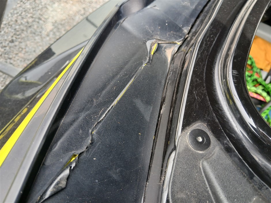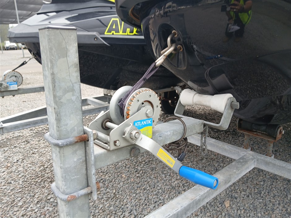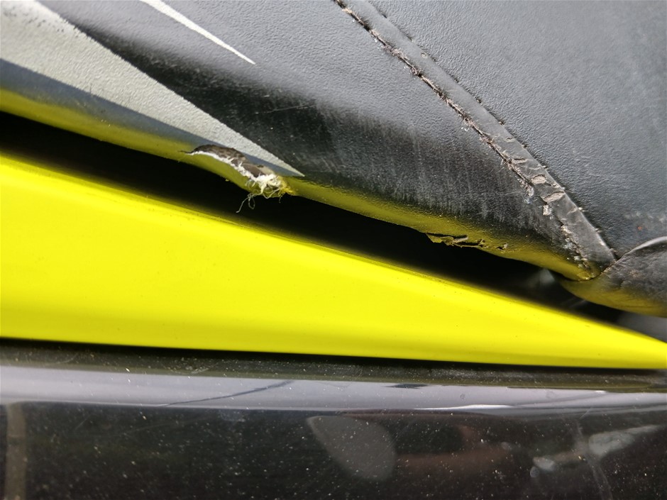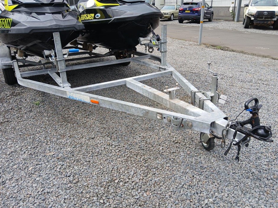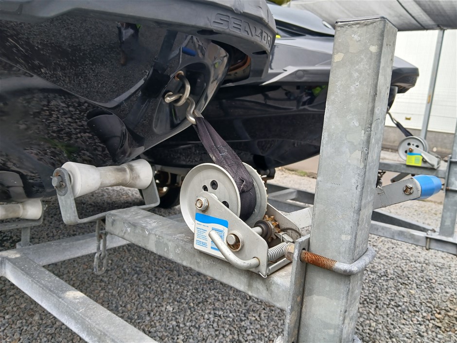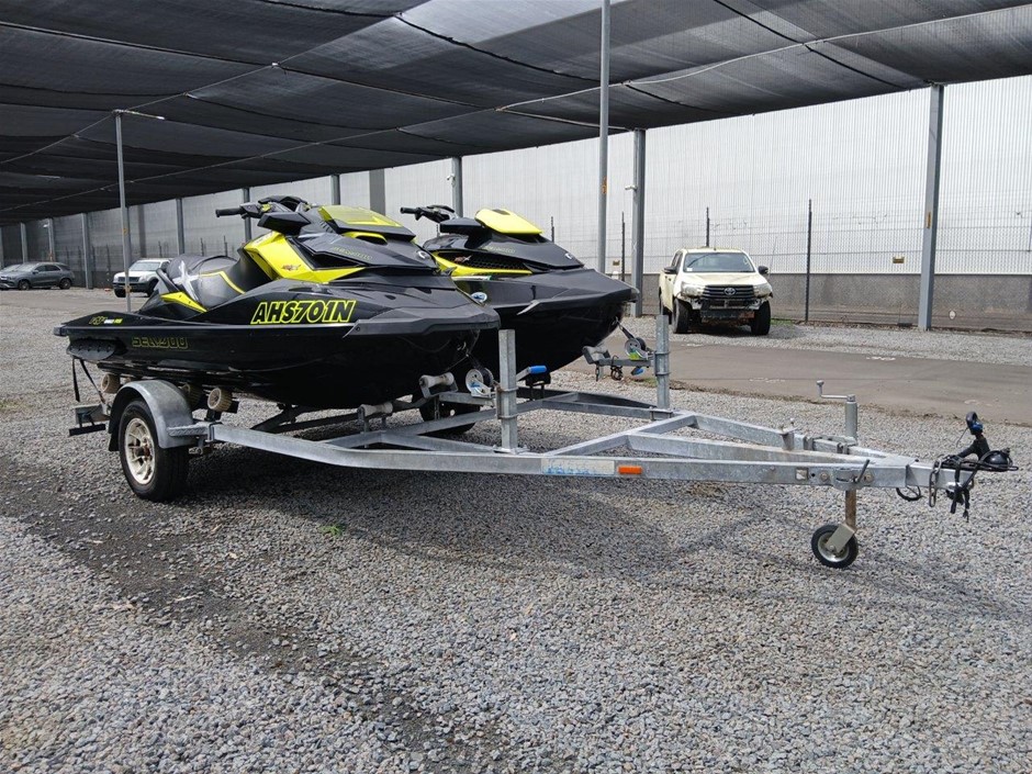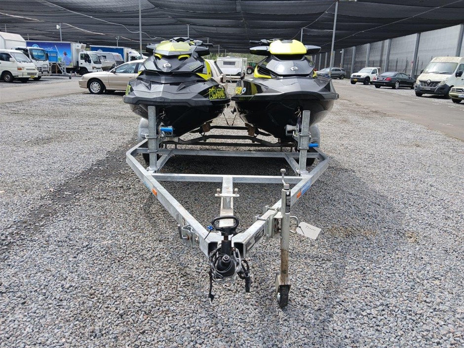 • Condition: Jetski`s and Trailer, Overall- General wear and tear. Dents, rust, scrapes, scuff marks and scratches. May be some unseen damage on hull. HIN CA-YDV065841213 , seat to engine compartment, slightly difficult to unlock, as pin for locking mechanism is misaligned. Crack at right rear. HIN CAYDV19697D313, dash screen cracked. Two large cracks on left and right side of front compartment [refer to images No. 57, 58, 59] Jockey wheel has crack