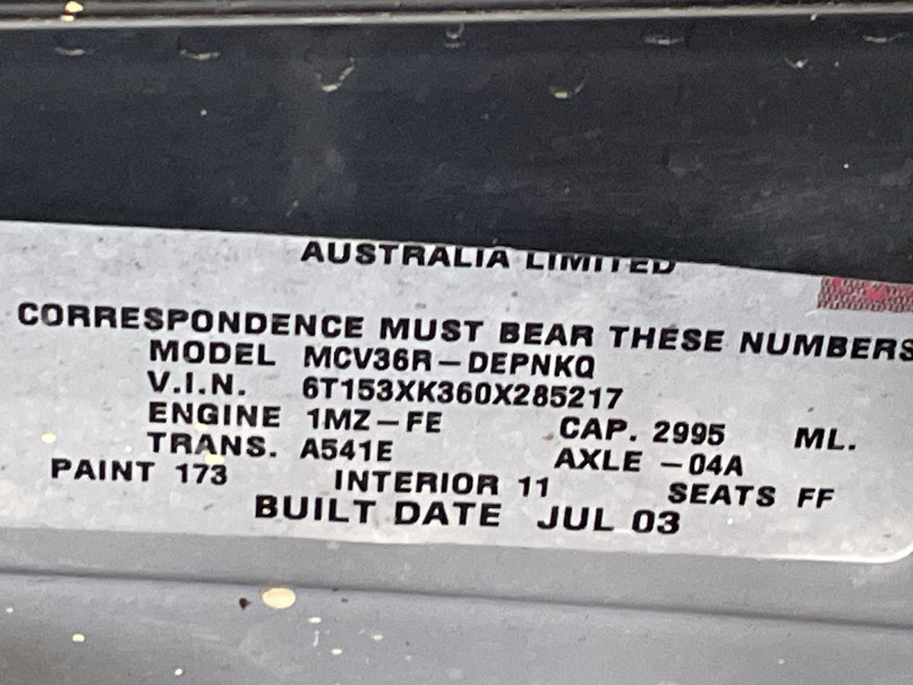 • VIN: 6T153XK360X285217