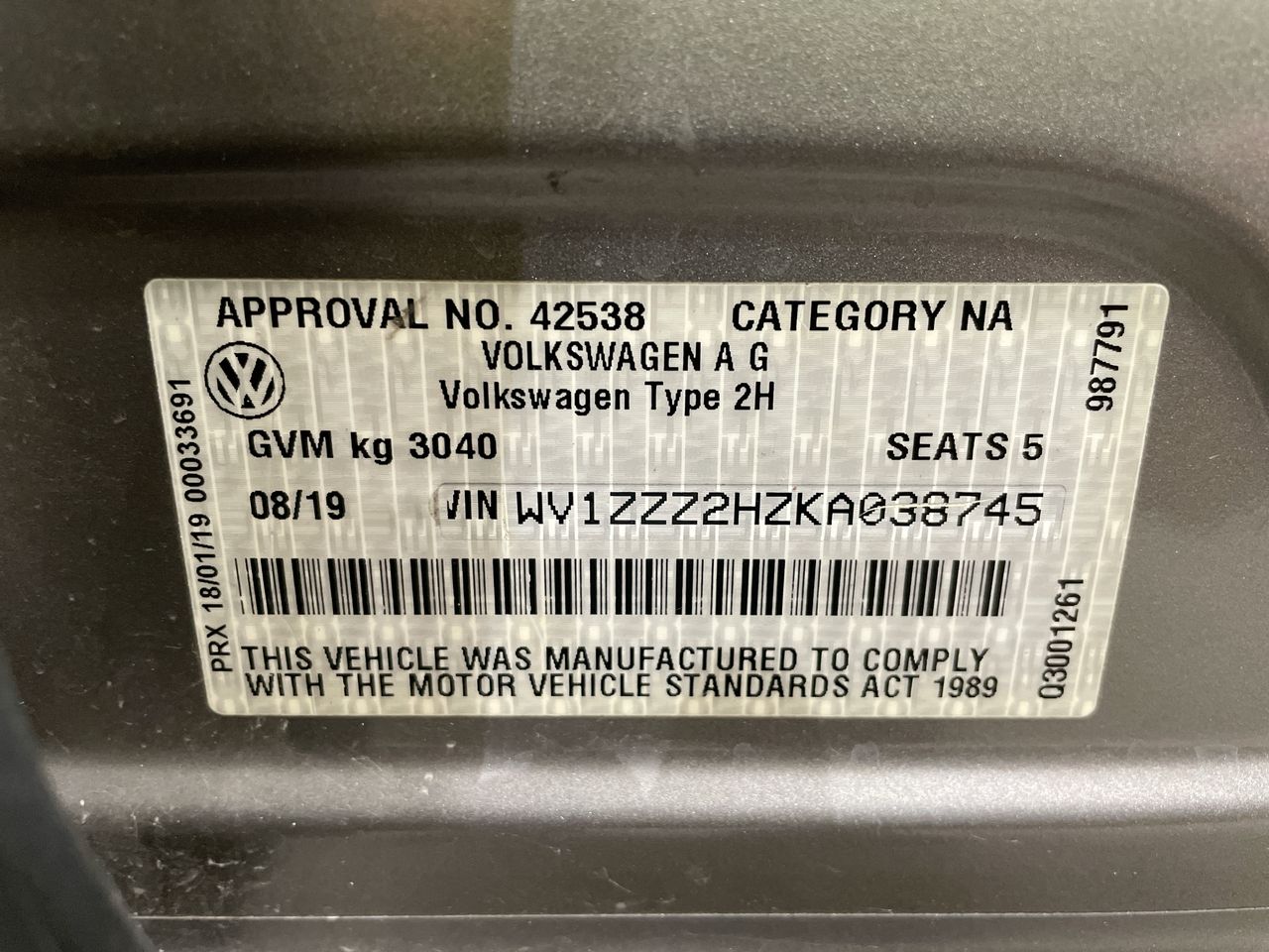 • VIN: WV1ZZZ2HZKA038745