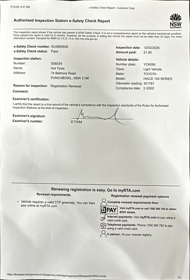 • Registration Expiry Date: 08-05-2026-Registration will only be transferred to the registered bidder who must hold a NSW Licence, otherwise, vehicle will be sold unregistered.