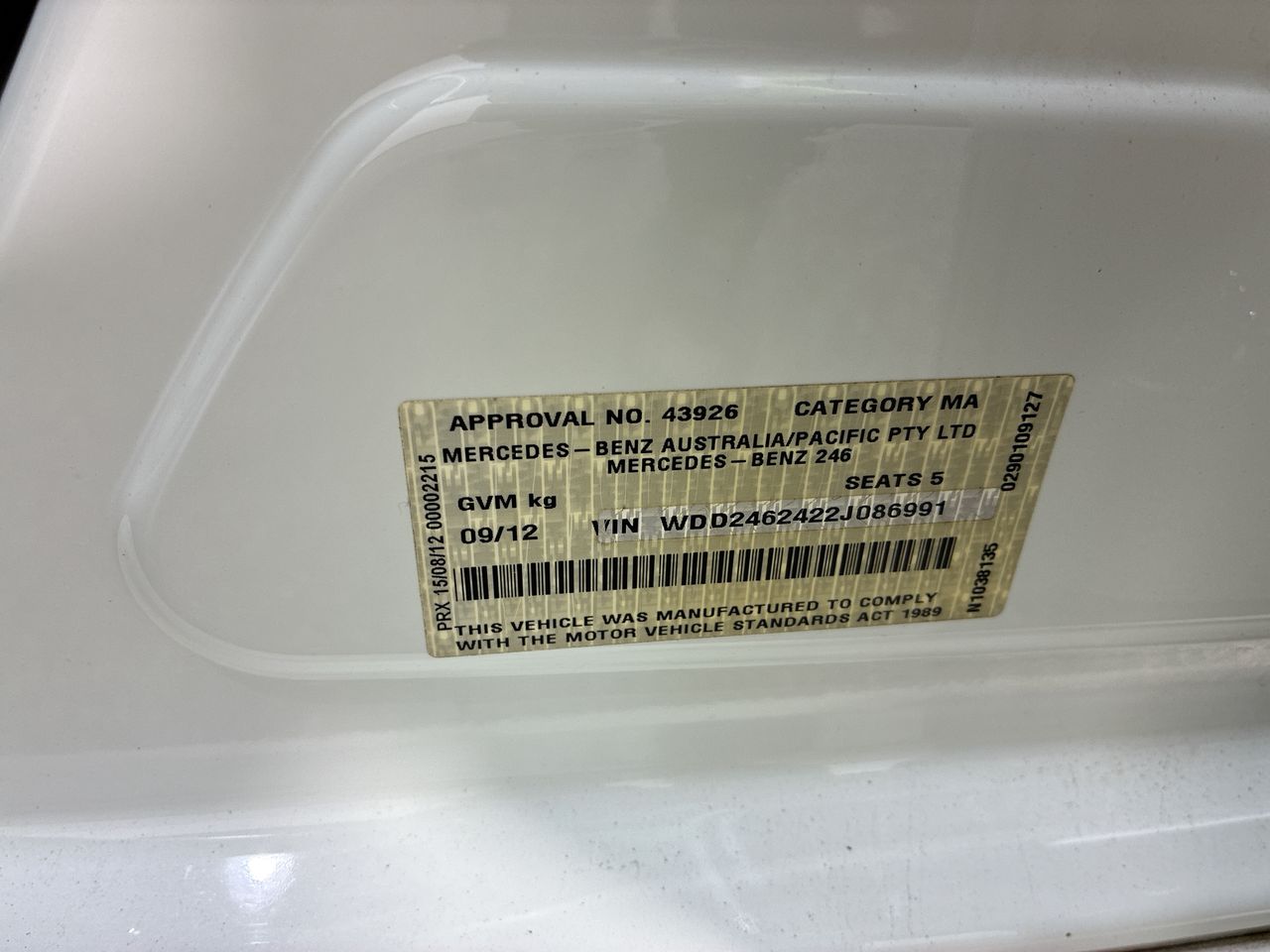 2012 Mercedes Benz B-Class B180 BE W246 Automatic Hatchback