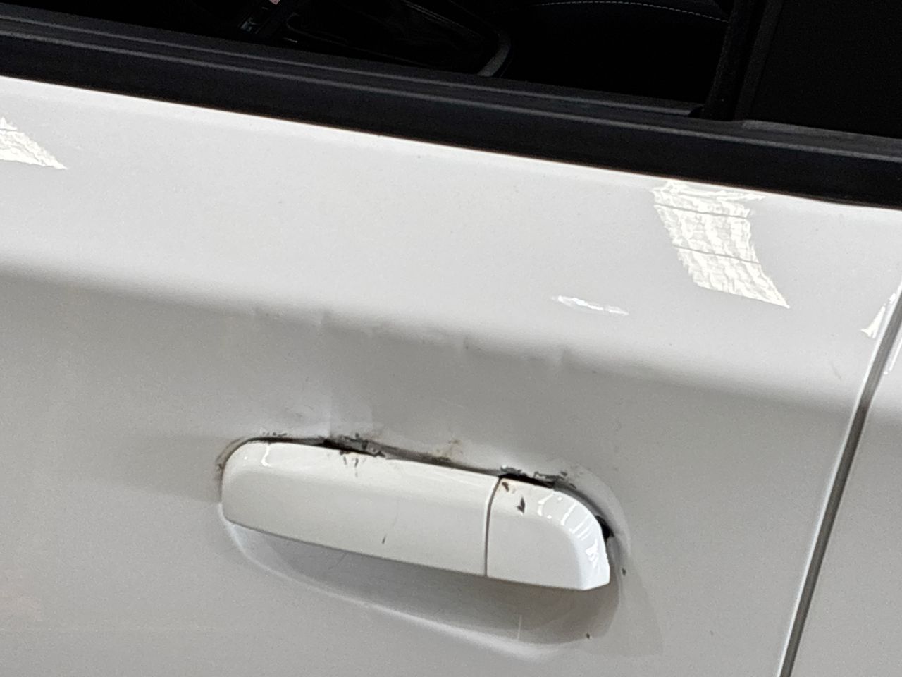 • Interior: TPMS light showing., Exterior: Passenger side front door handle broken. Passenger side rear door quarter glass missing. Park brake not working. Rear windscreen wiper broken, visible chips in paintwork