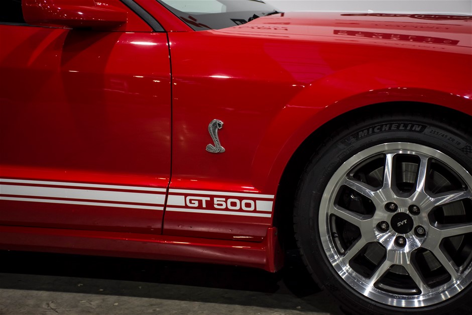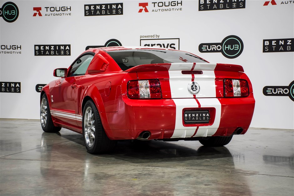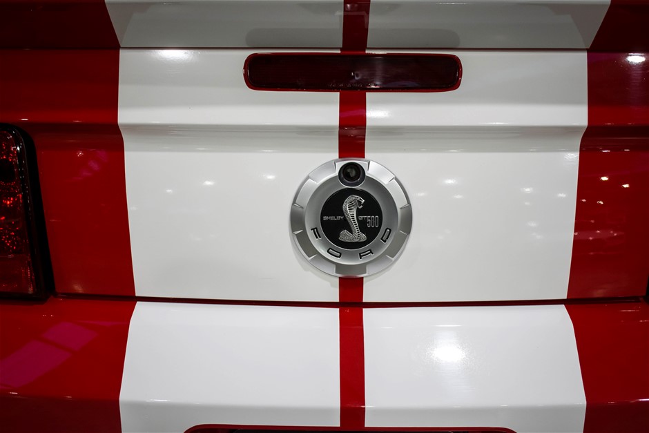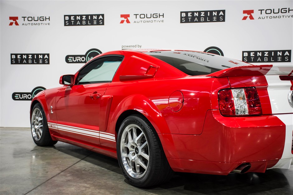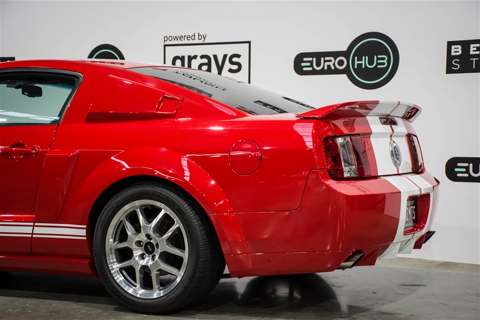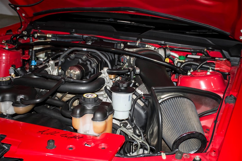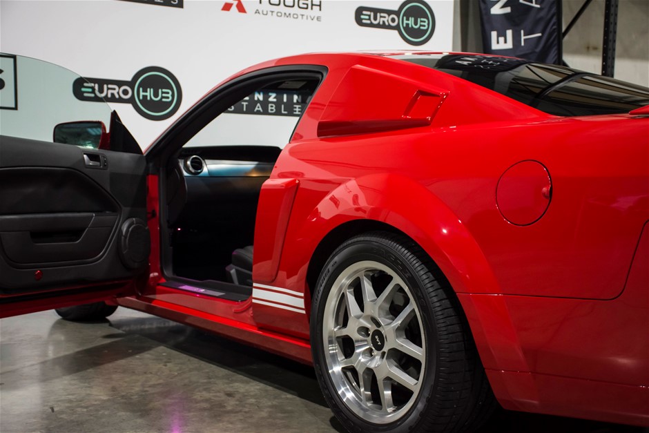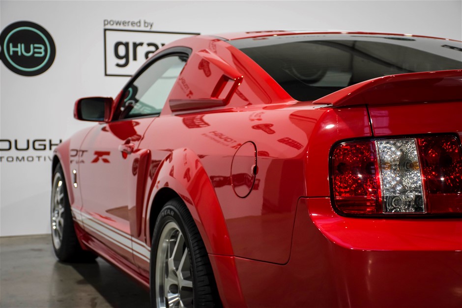 The car was purchased by the current owner almost 10 years ago. The car has previously been converted by Performax in QLD. The car is finished in Torch Red with white stripes and features all of the usual Shelby GT500 styling with unique body kit and badging. The car has been fitted with an extra scoop panel on the side and infill panels over the rear side windows. The car sits on a set of genuine factory Shelby 18” SVT wheels.