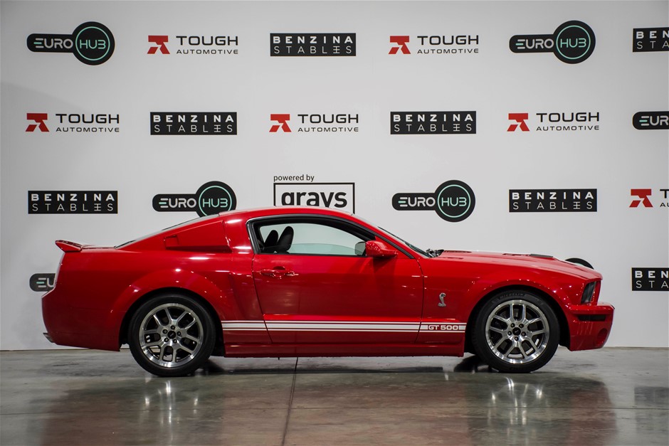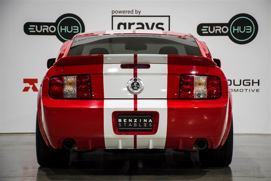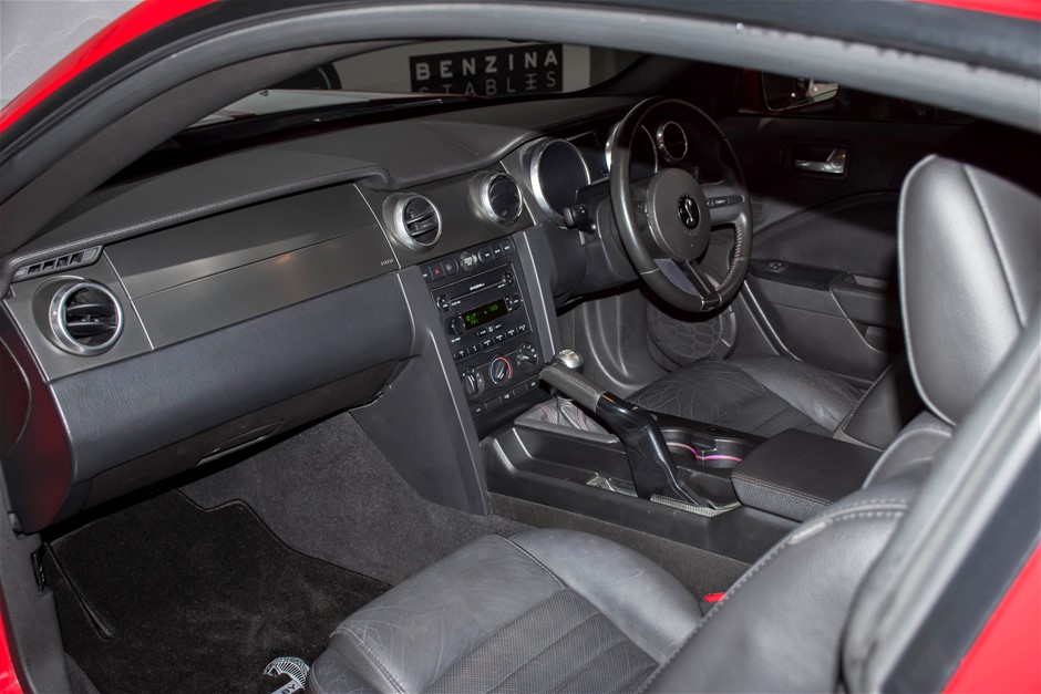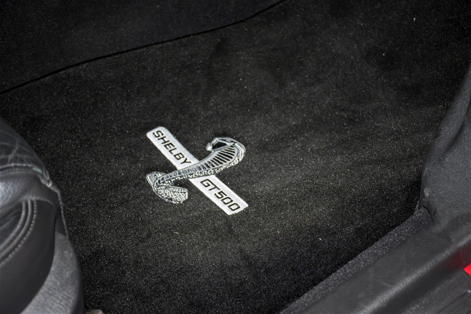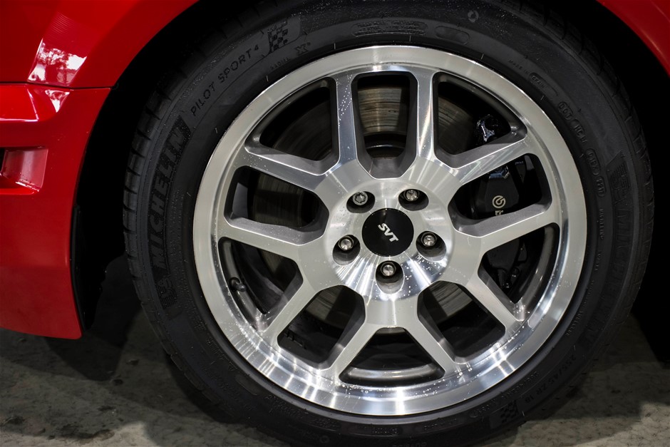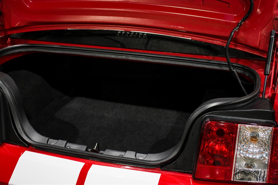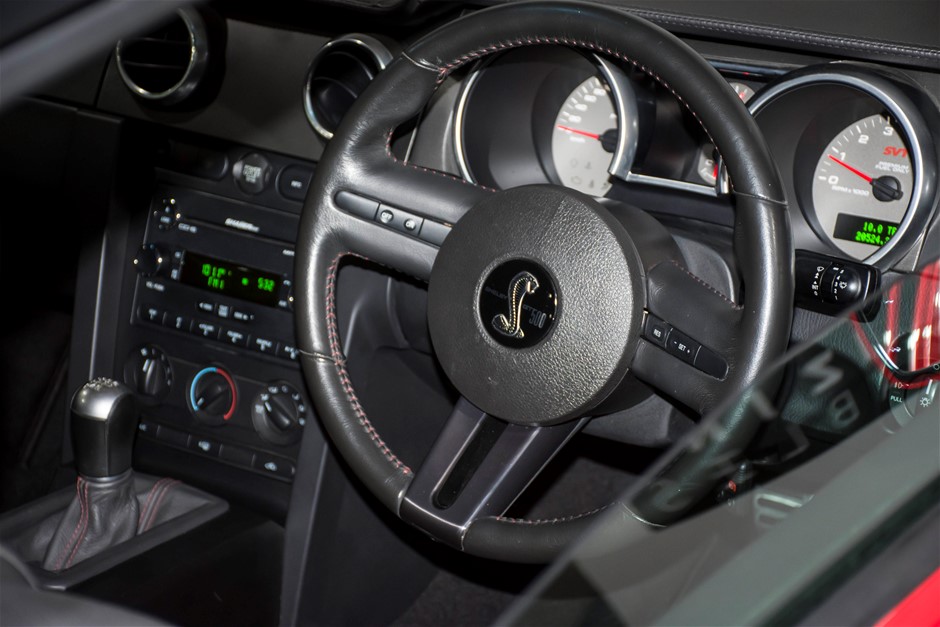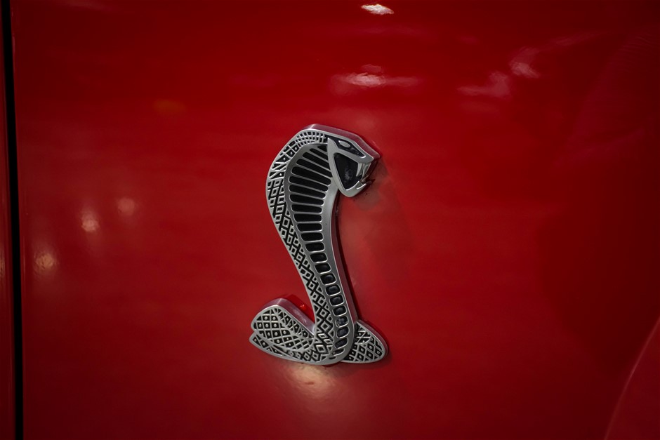 The car was purchased by the current owner almost 10 years ago. The car has previously been converted by Performax in QLD. The car is finished in Torch Red with white stripes and features all of the usual Shelby GT500 styling with unique body kit and badging. The car has been fitted with an extra scoop panel on the side and infill panels over the rear side windows. The car sits on a set of genuine factory Shelby 18” SVT wheels.