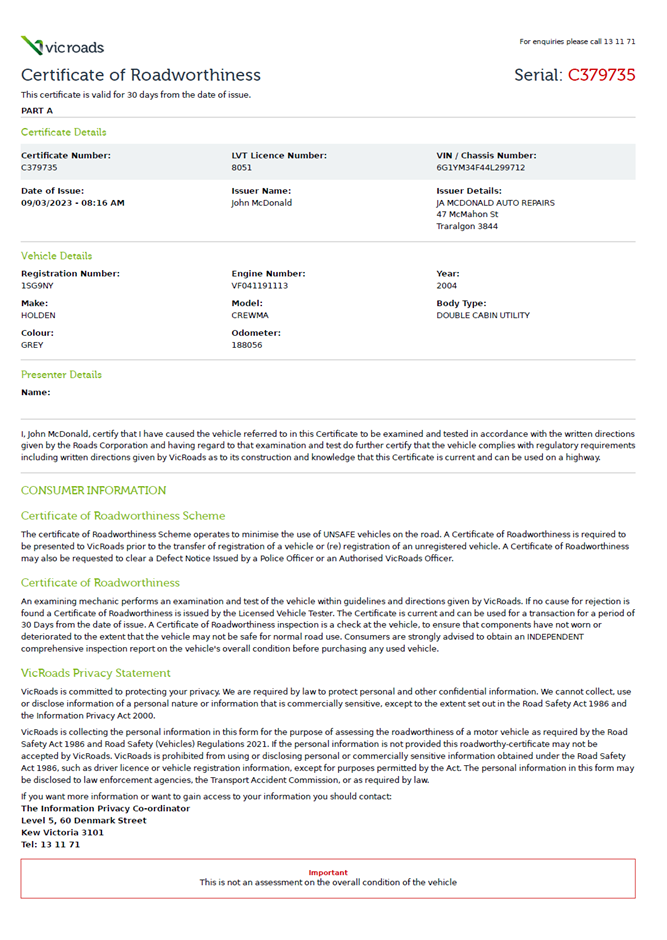 For further advice and information regarding Registration in VIC please CLICK HERE to be directed to the VIC Roads website.