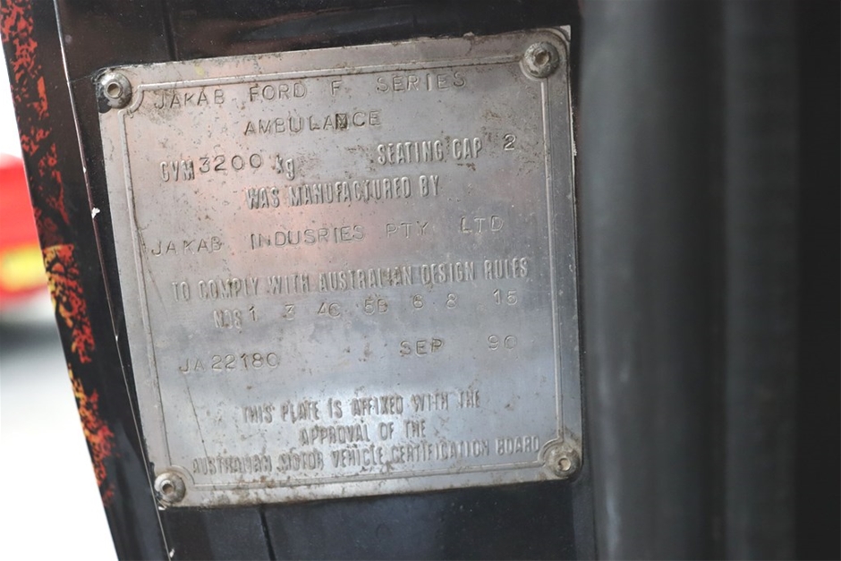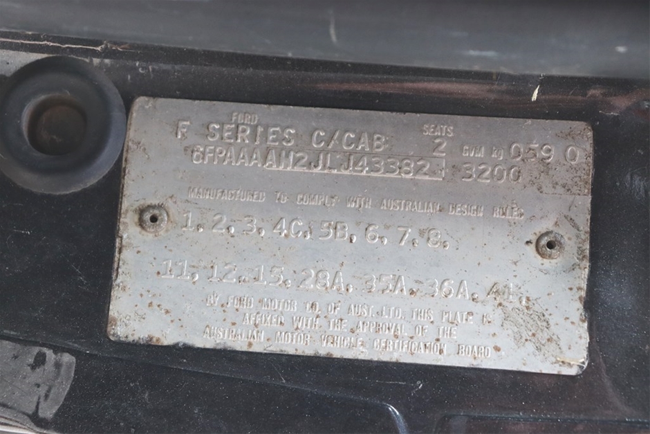 Originally built as an ambulance, this F-Series truck has been customised to be a flat tray utility. Conversion details and identification plates can be seen in the photos