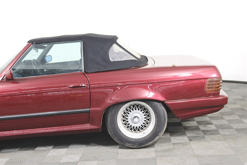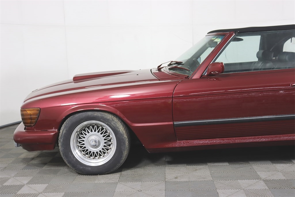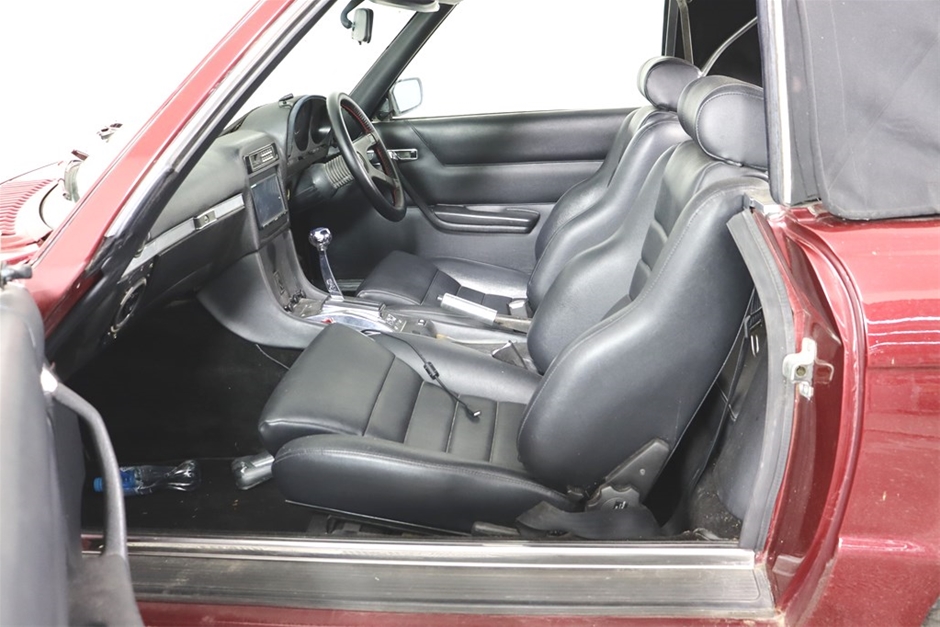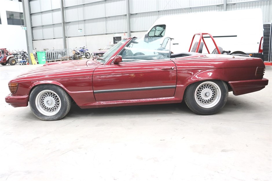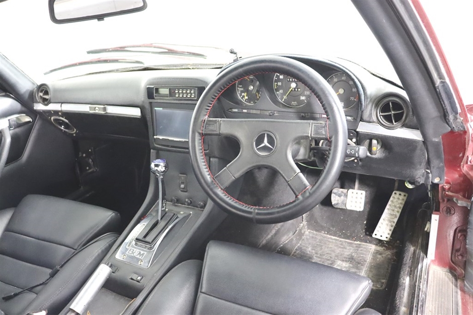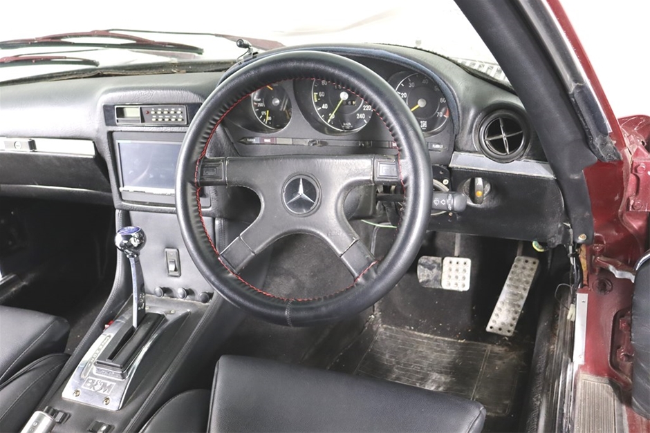 This Mercedes Benz 350SL has been modified inside and out, and has a QLD mod plate from 2007 for the conversion to a Chevrolet V8 and Automatic gearbox. With a B&M shifter, Holley Carb, custom interior, custom maroon paintwork, and custom bonnet scoop. Something a little different!