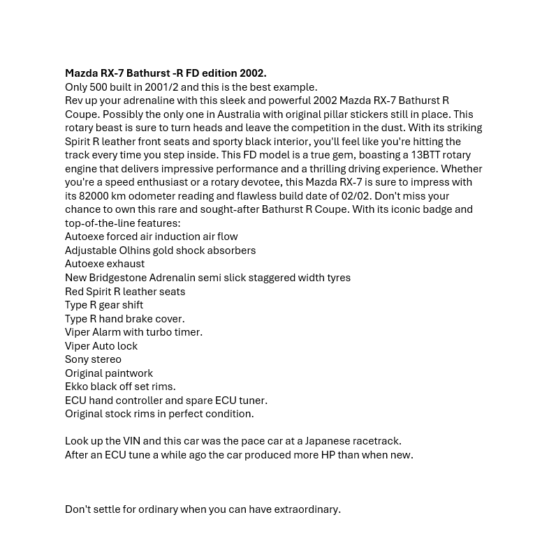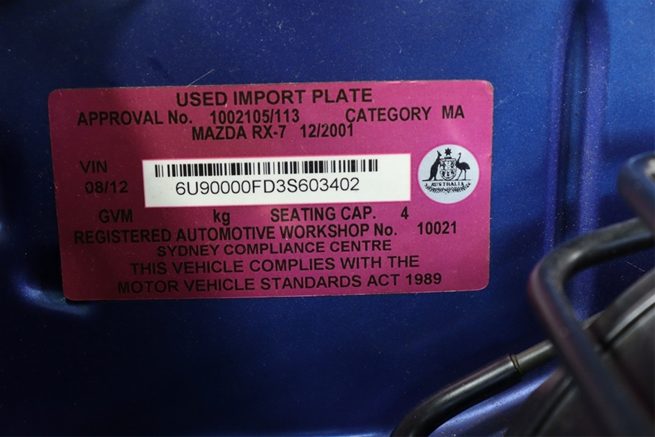 Part of Sale 2001 Mazda RX-7 Type R Bathurst Edition (Import) Man Coupe