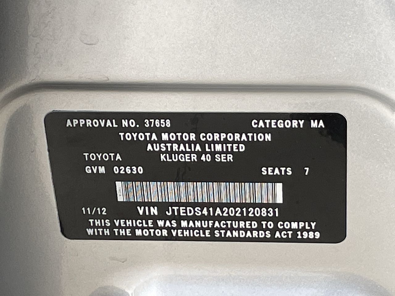 2012 Toyota Kluger 4X2 KX-R GSU40R Automatic 7 Seats Wagon