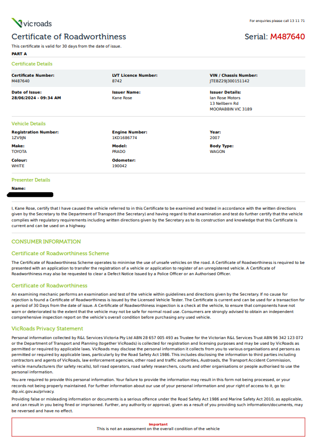 For further advice and information regarding Registration in VIC please CLICK HERE to be directed to the VIC Roads website.
