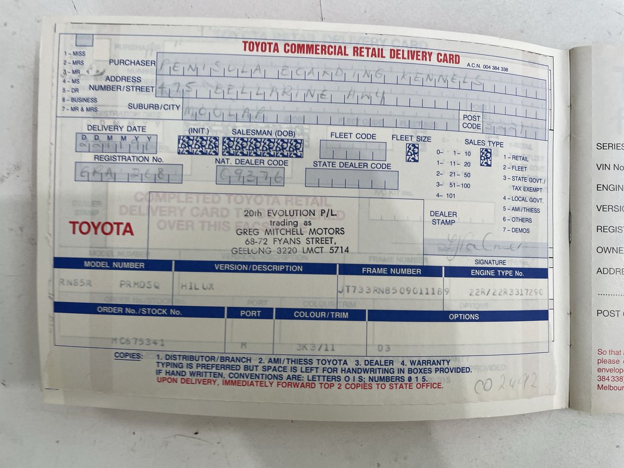 As registration and ownership requirements vary from state to state buyers should familiarise themselves with the registration requirements of the state in which the vehicle will be registered. As is standard auction practice the buyer is responsible for state transfer fees, duties etc. that may apply. Please note: Current Vic registered vehicles can only be transferred to Vic license holders. The number plates will be removed if the vehicle is unregistered or has interstate plates. You can acquire an unregistered vehicle permit from your local state roads authority for pick up. For VIC registration, once your invoice is paid, you’ll need to visit Vic Roads with: