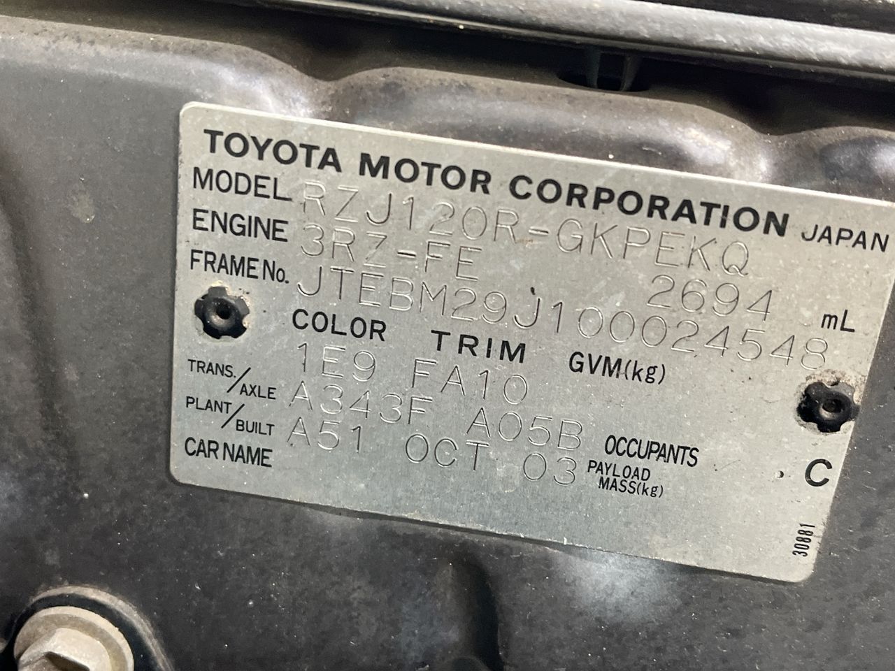 Part of Sale 2003 Toyota Landcruiser Prado Prado GX (4x4) RZJ120R