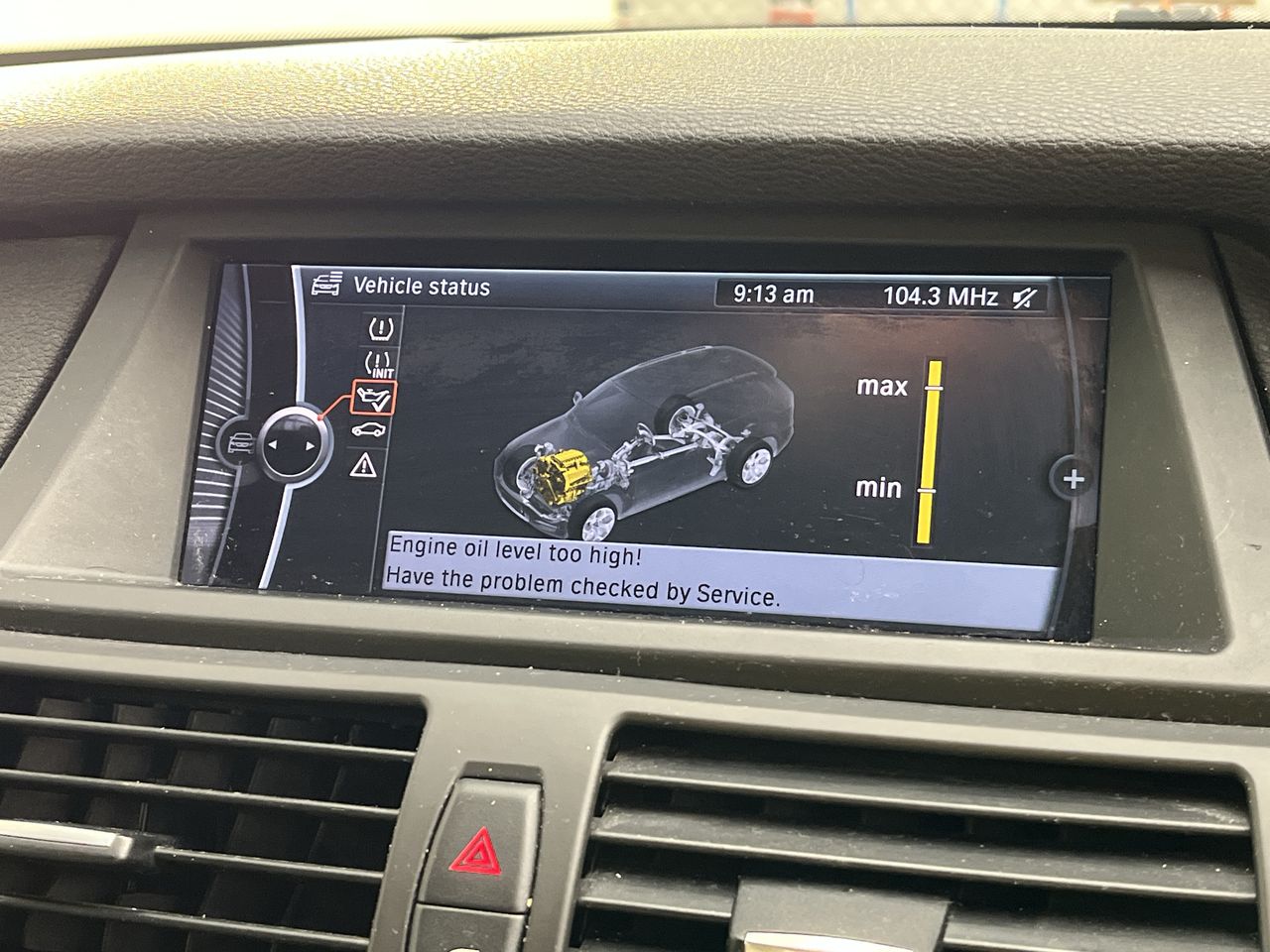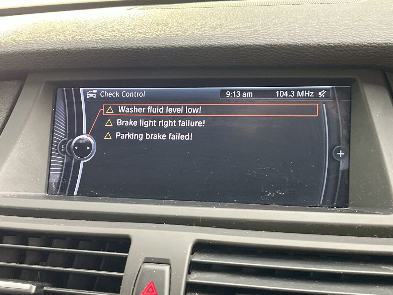 • Interior: Engine oil level high, washer fluid low, right brake light failure, and parking brake failure indicated on the display screen.