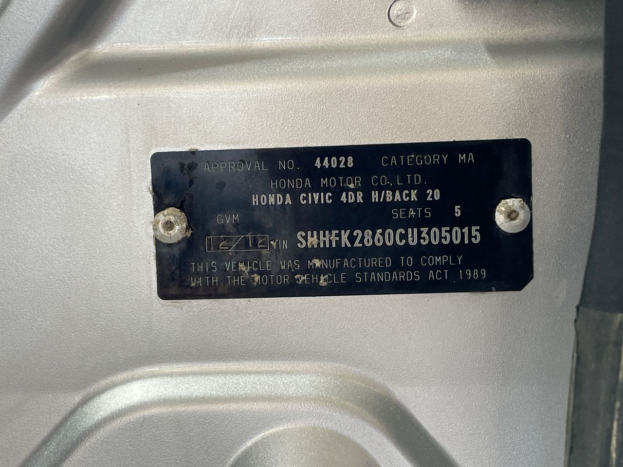 • VIN: SHHFK2860CU305015