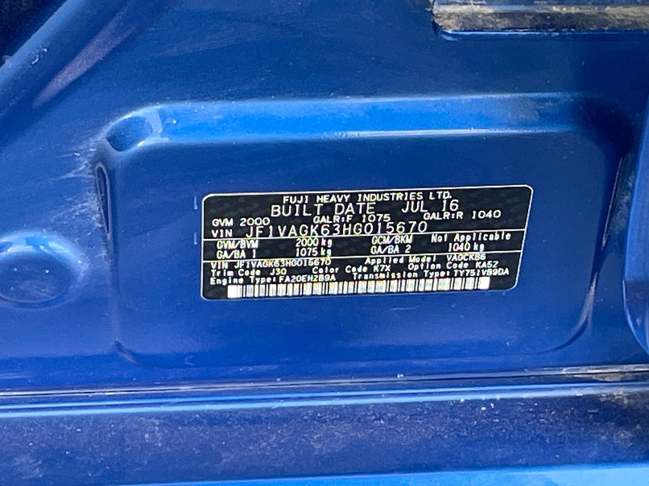 • VIN: JF1VAGK63HG015670