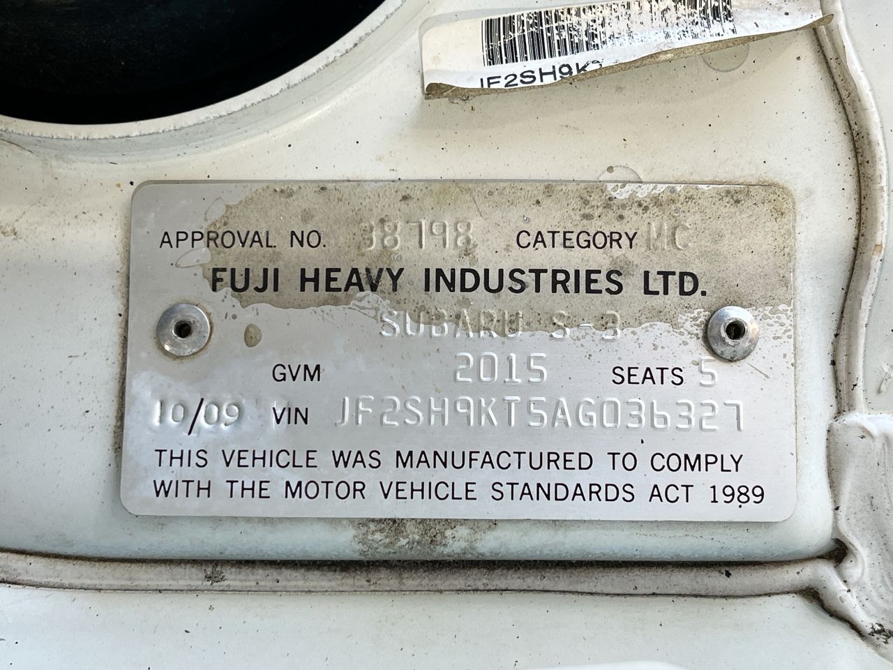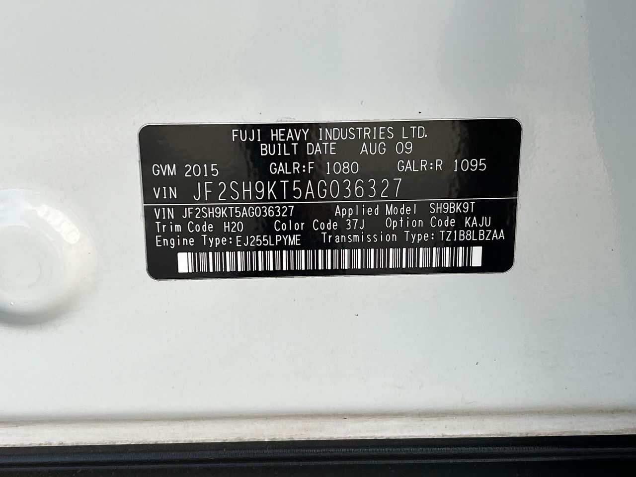 • VIN: JF2SH9KT5AG036327