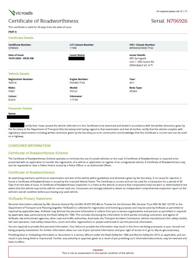 2011 Ford Focus Ambiente LW Automatic Hatchback (RWC Issued 14-01-26)