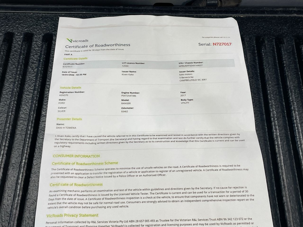 | Part of Sale | 2017 Ford Ranger Wildtrak 4x4 PX II Automatic Dual Cab - RWC Issued 19/1/26 | ||||||||||||||