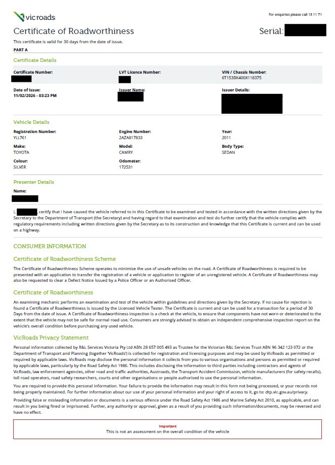 • Registration Expiry Date: 25-07-2026 - Registration will only be transferred to the registered bidder who must hold a valid VIC Drivers Licence otherwise vehicle will be sold unregistered.