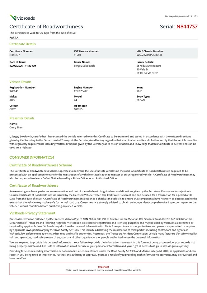 For further advice and information regarding Registration in VIC please CLICK HERE to be directed to the VIC Roads website.