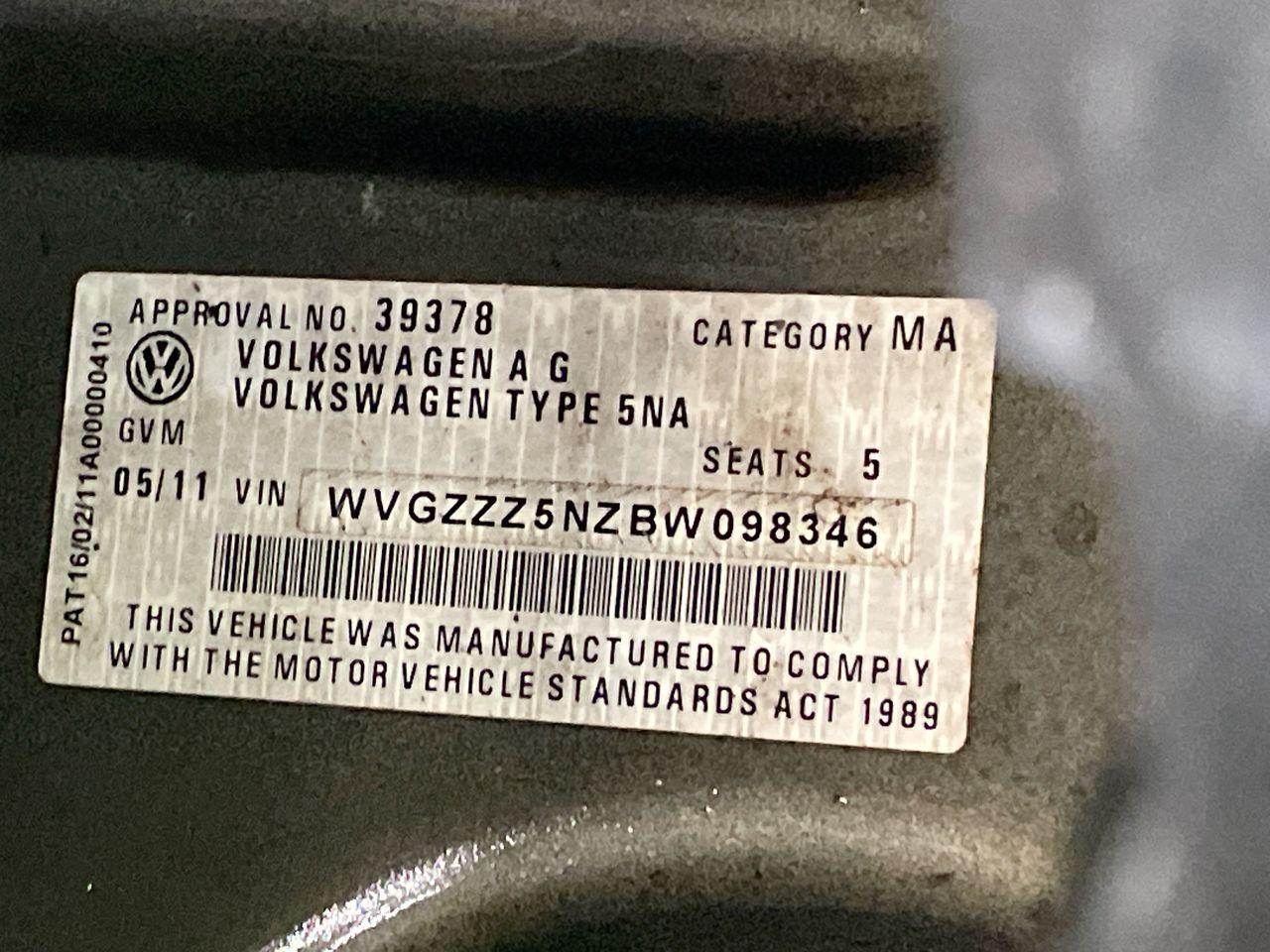 • VIN: WVGZZZ5NZBW098346