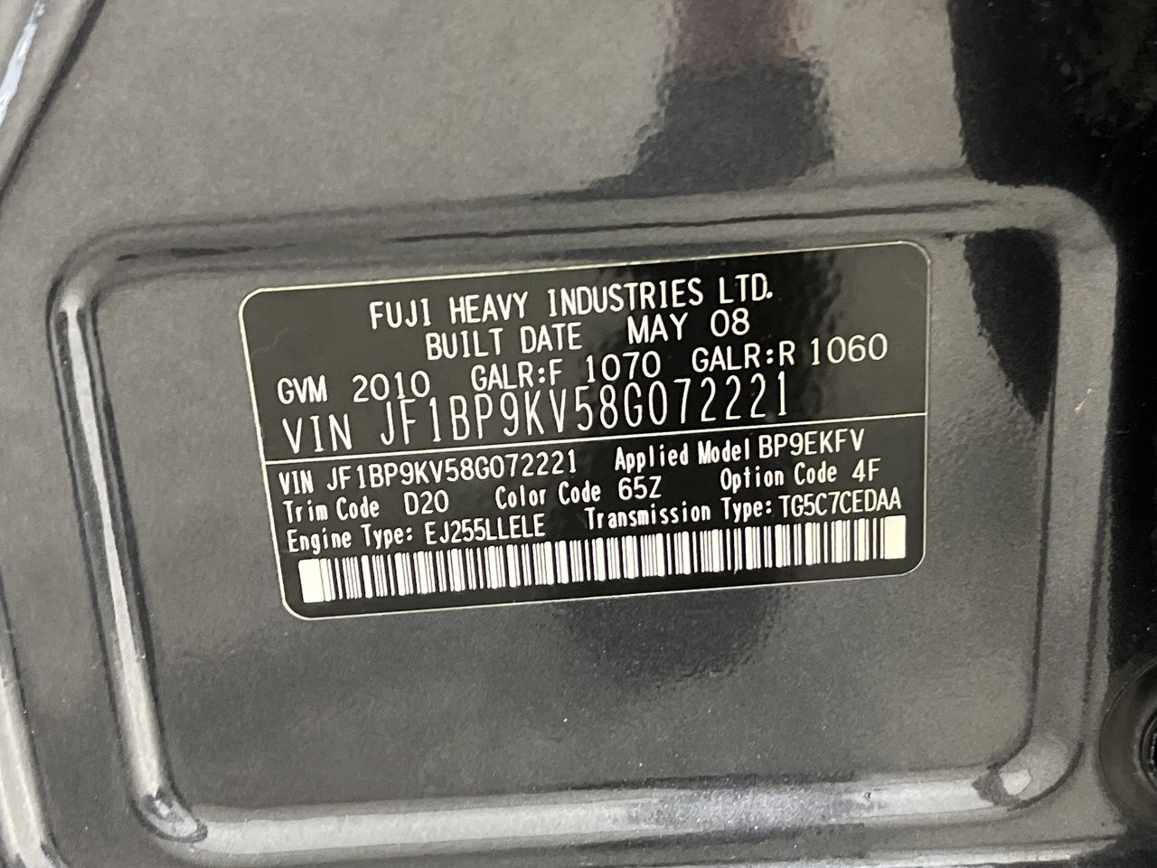 • VIN: JF1BP9KV58G072221