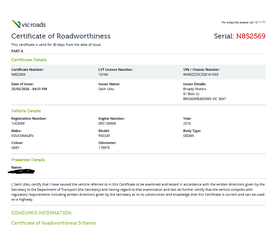 • Registration Expiry Date: 10-06-2026 - Registration will only be transferred to the registered bidder who must hold a valid VIC Drivers Licence otherwise vehicle will be sold unregistered.