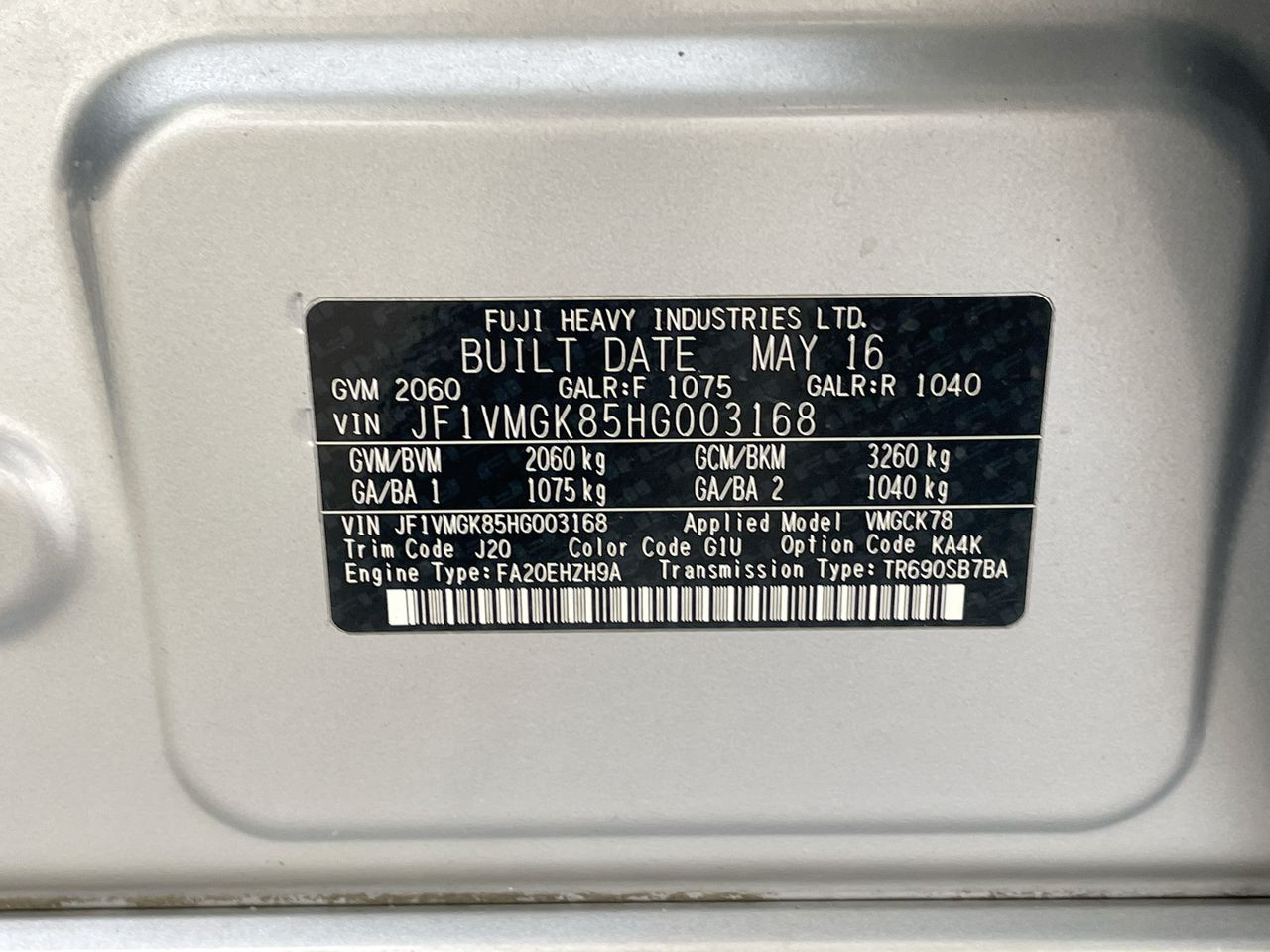 • VIN: JF1VMGK85HG003168