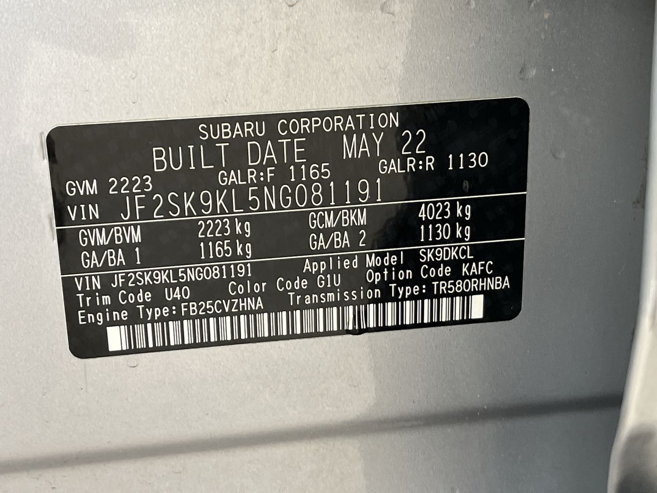 • VIN: JF2SK9KL5NG081191