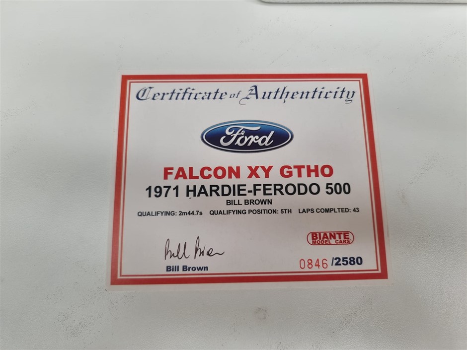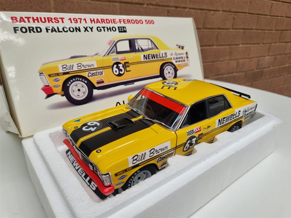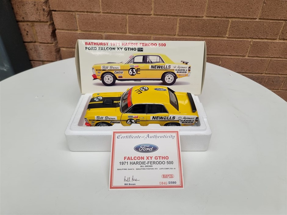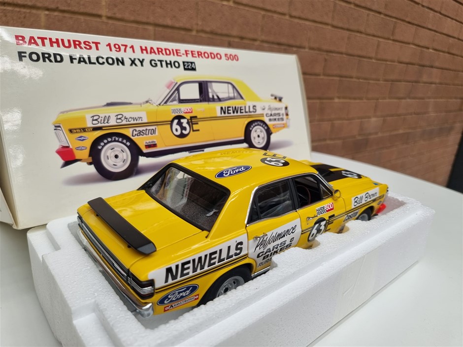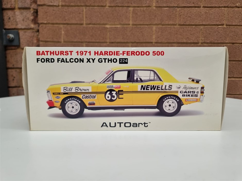 Bathurst 1971 Hardie Ferodo 500, Ford Falcon XY GTHO #63E Bill Brown Newells Performance Cars & Bikes 1/18 Scale By Autoart, Certificate of Authenticity Signed By Bill Brown, #0846 of # 2580 Pieces Worldwide, As New In Box Never Displayed (SN:224) (295927-224)