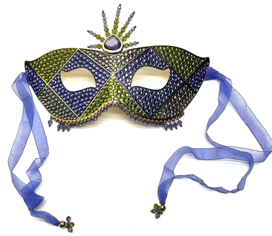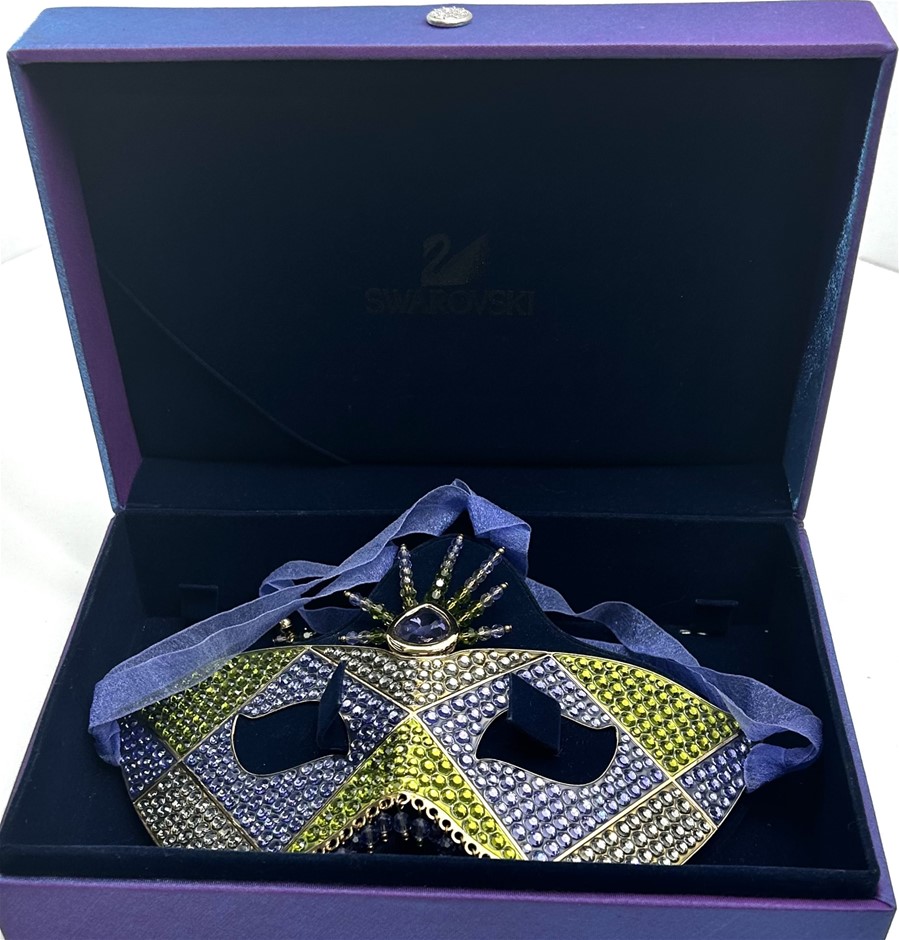 number 2001/3000, amethyst purple/white/peridot green colours, 2 side purple ribbons with gold plated ball tip & multi coloured crystals ends, mask measures 21x11cm, hallmark Swarovski swan, original purple/blue velvet box & outer box. This item has been professionally verified as a genuine product and comes with accompanying 3rd party Certificate of Authenticity (306432-1)
