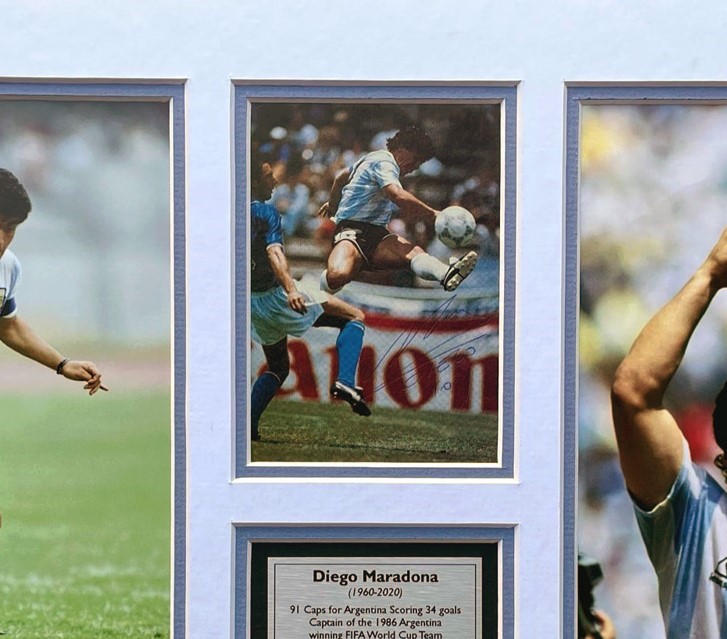 Incredible early hand signed 6x4 image of Diego Maradona playing in the Argentina strip nicely framed with unsigned 10x8 photographs either side and a detailed career plaque to base. Beautifully framed and presented. Includes certificate of authenticty. (312766-1)