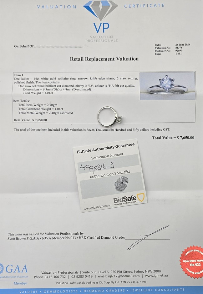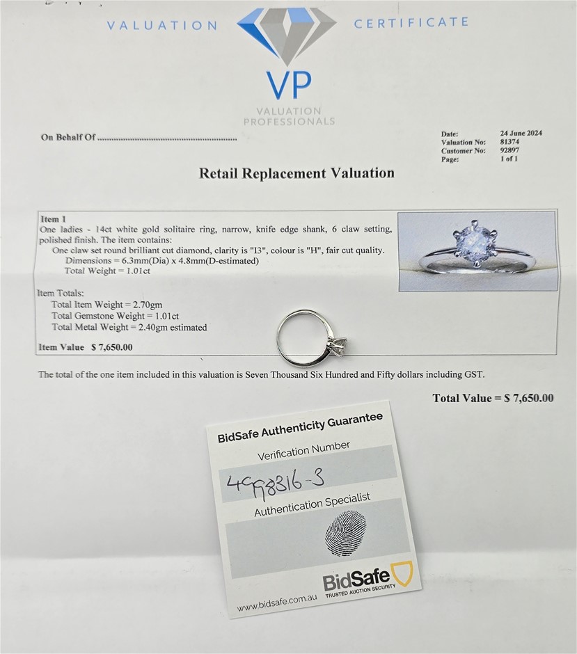1 CARAT DIAMOND AND WHITE GOLD ENGAGEMENT RING - VALUATION $7,650.00