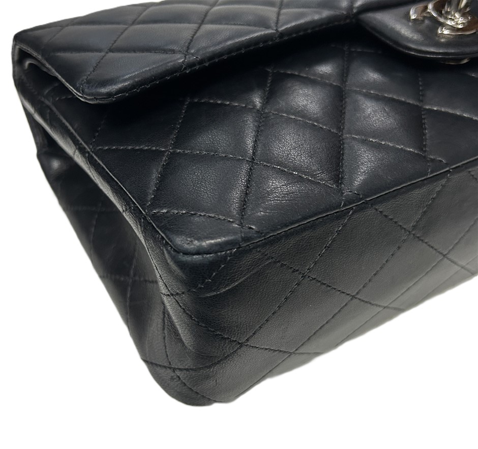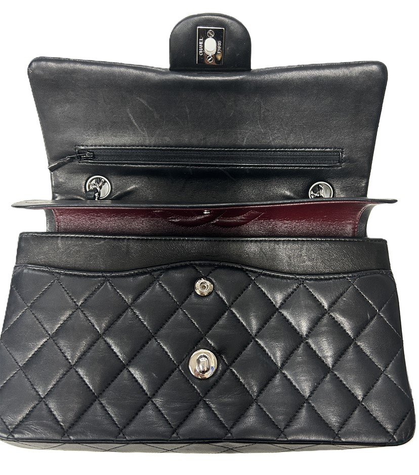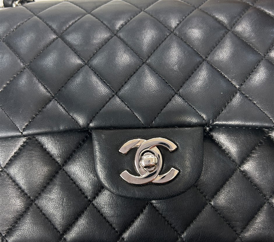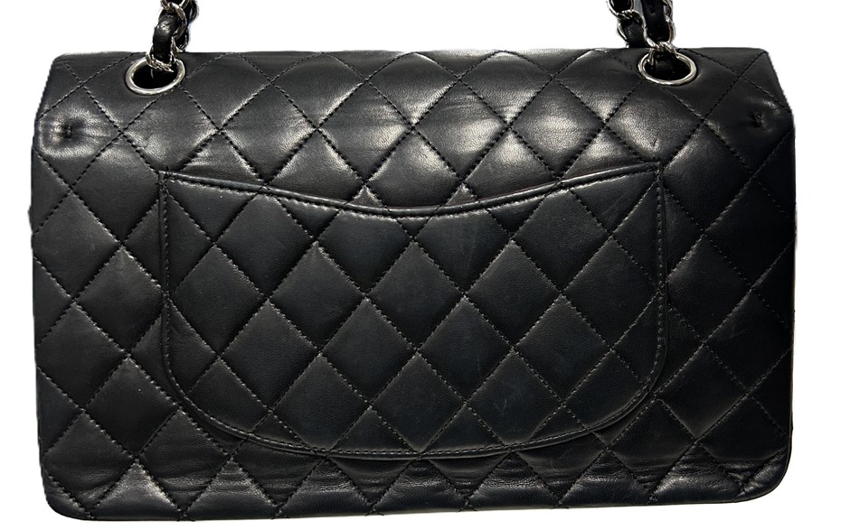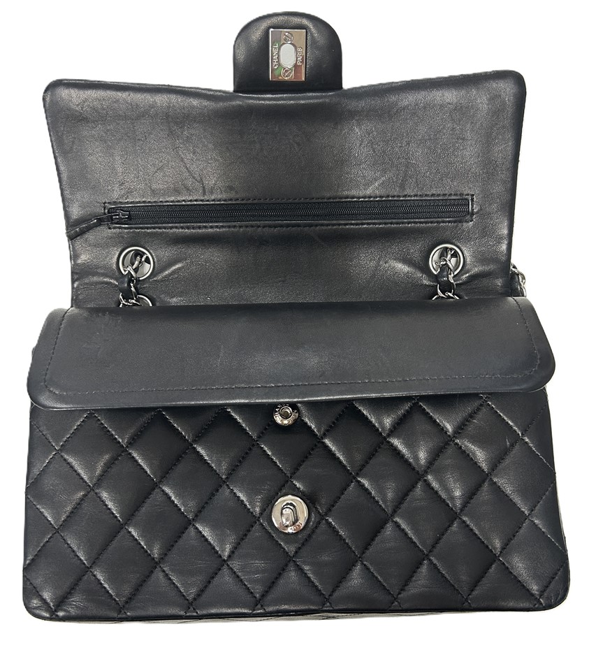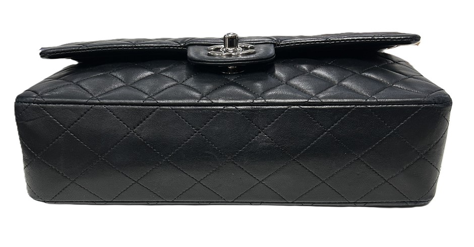 black lambskin quilted leather, smile back pocket, silver tone hardware, CC turn lock closure, leather & chain shoulder strap, bag measures 15.5 x 25.5 x 6.5cm, made in France, signs of wear on the bottom & corners of bag, some slight scratches on leather lining & outer material due to age, refer to photos. This item has been professionally verified as a genuine product and comes with accompanying 3rd party Certificate of Authenticity & Chanel Authenticity Card. (320940-138)
