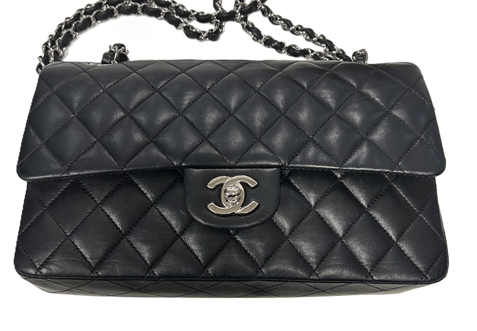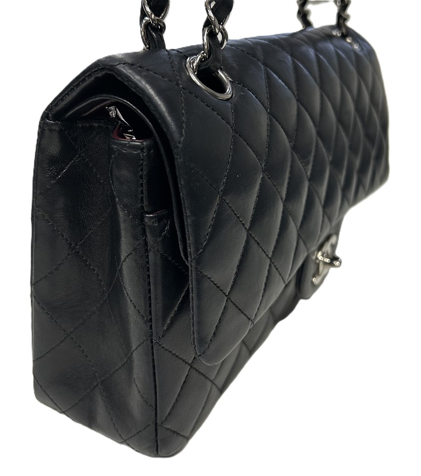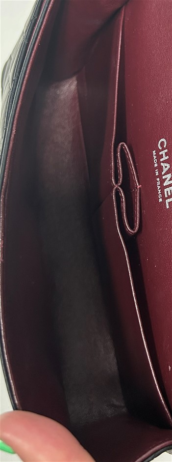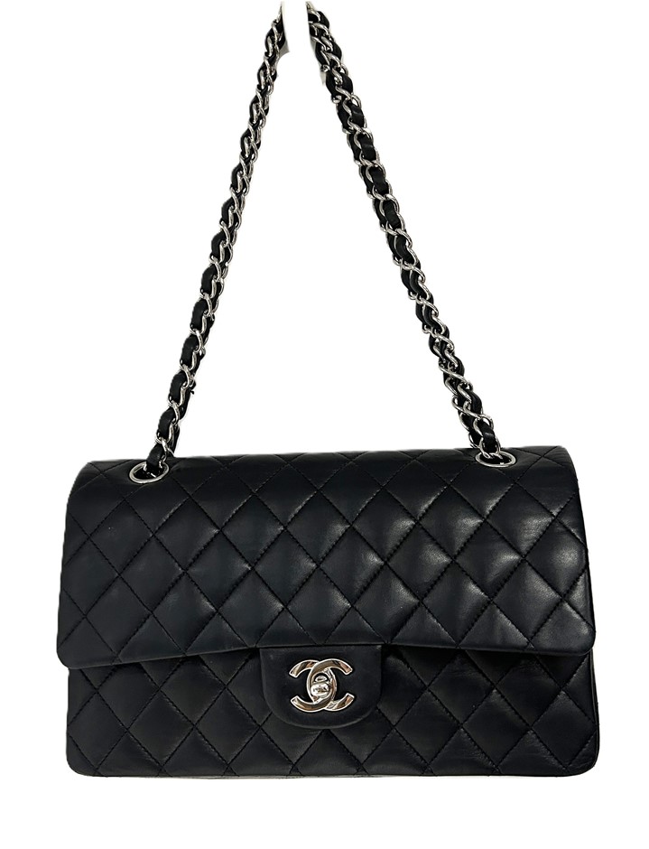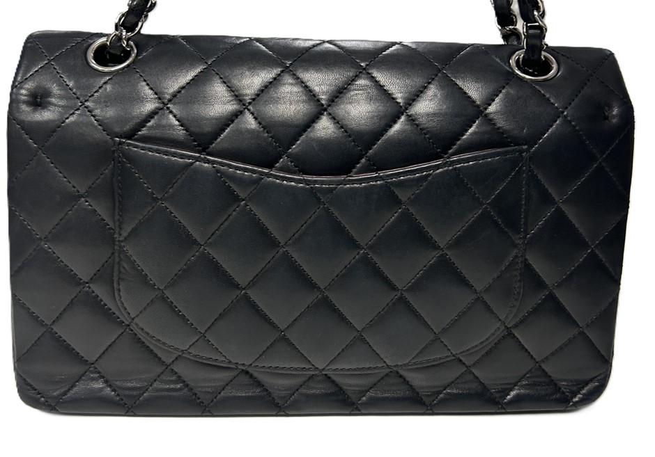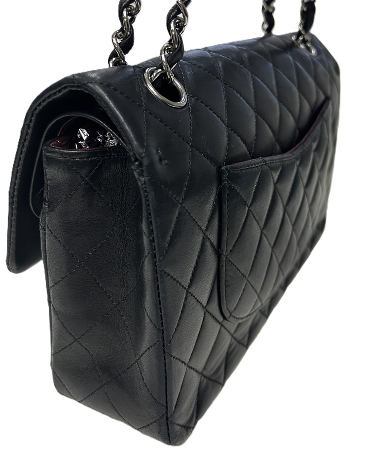 black lambskin quilted leather, smile back pocket, silver tone hardware, CC turn lock closure, leather & chain shoulder strap, bag measures 15.5 x 25.5 x 6.5cm, made in France, signs of wear on the bottom & corners of bag, some slight scratches on leather lining & outer material due to age, refer to photos. This item has been professionally verified as a genuine product and comes with accompanying 3rd party Certificate of Authenticity & Chanel Authenticity Card. (320940-138)