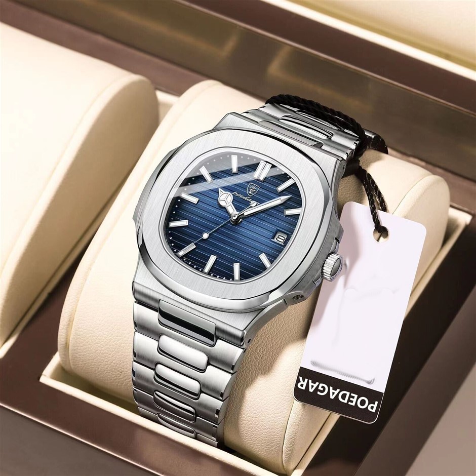 POEDAGAR Silver Blue SS Square Quartz Watch