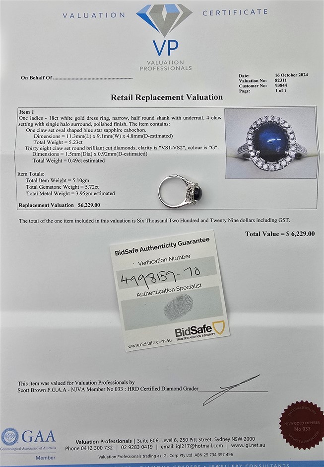 5.72 CARAT DIAMOND AND SAPPHIRE RING - VALUATION $6,229.00