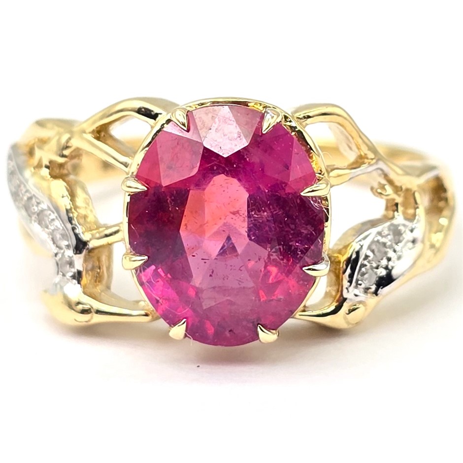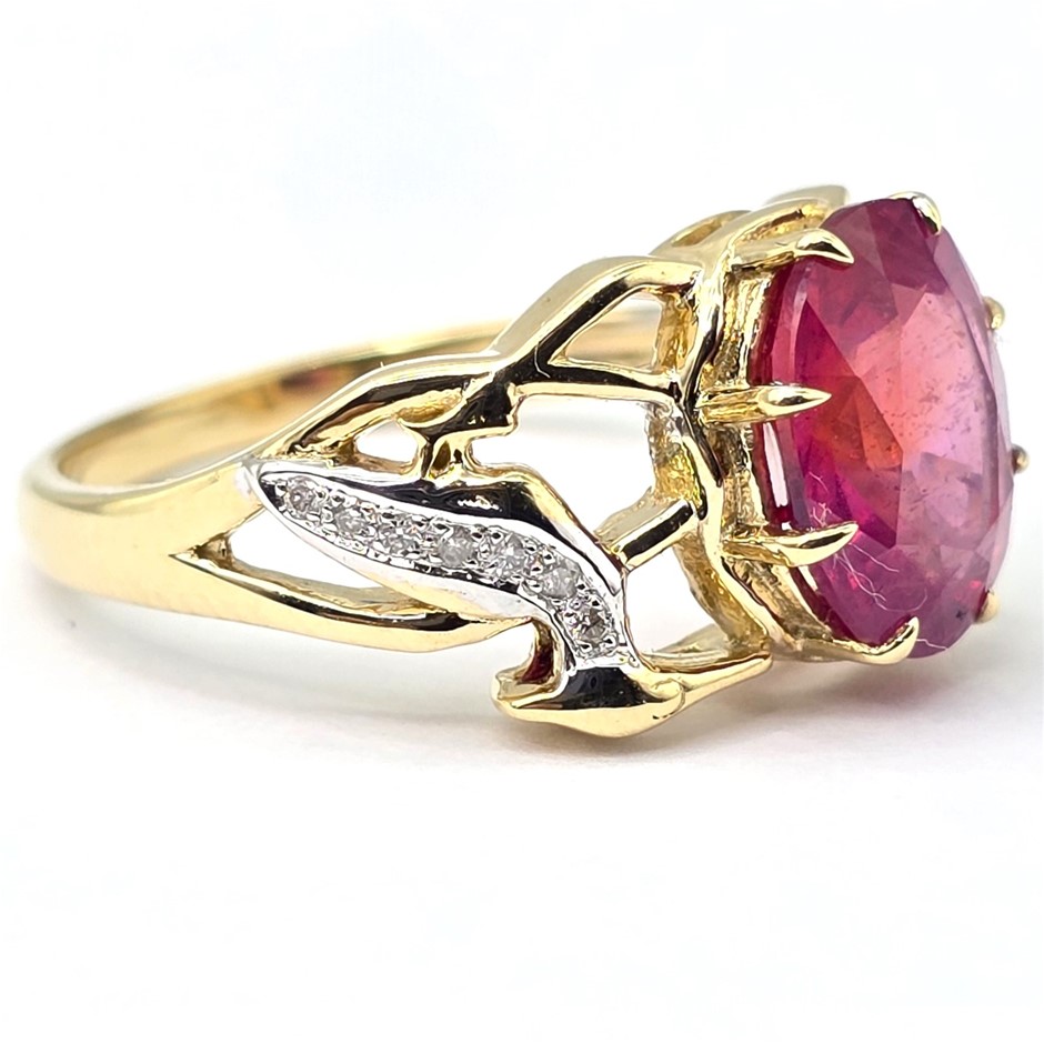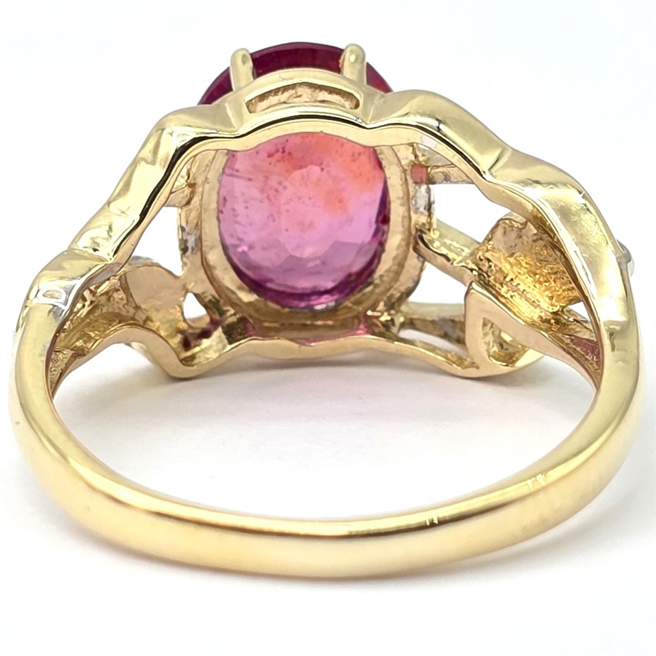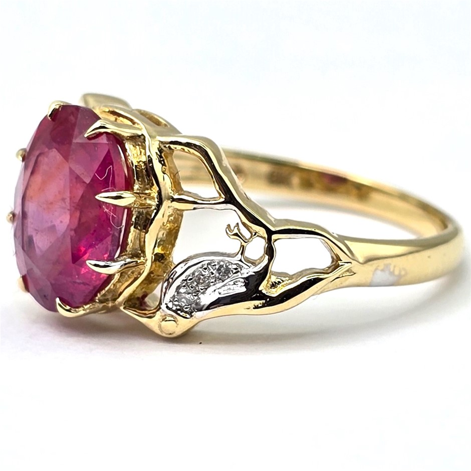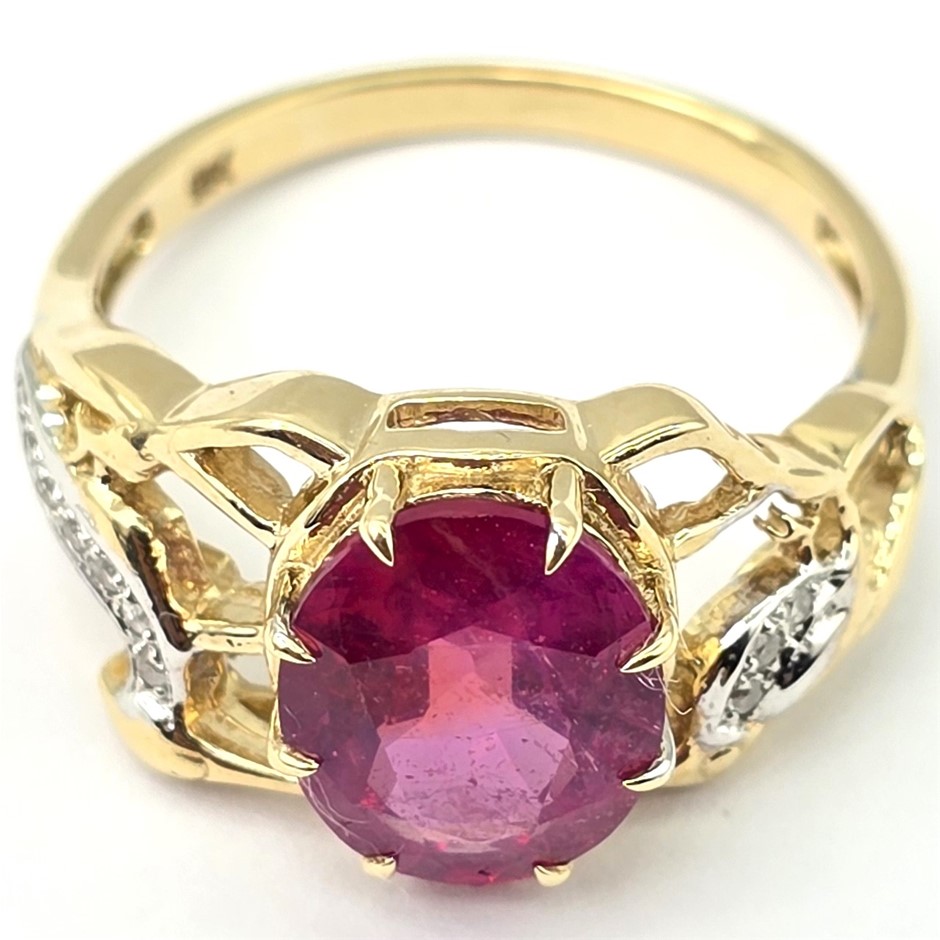 • 9ct Yellow Gold Designer Ring Set With A Natural Ruby And Natural Diamonds.