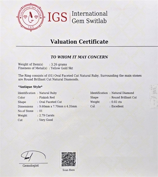 • Accompanied by a Retailers Formal Valuation and Gemmologist Report issued by International Gem Switlab
