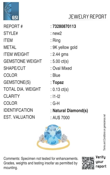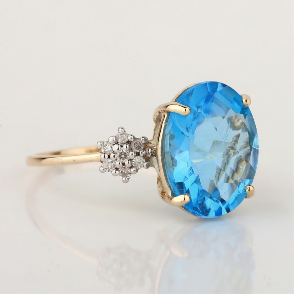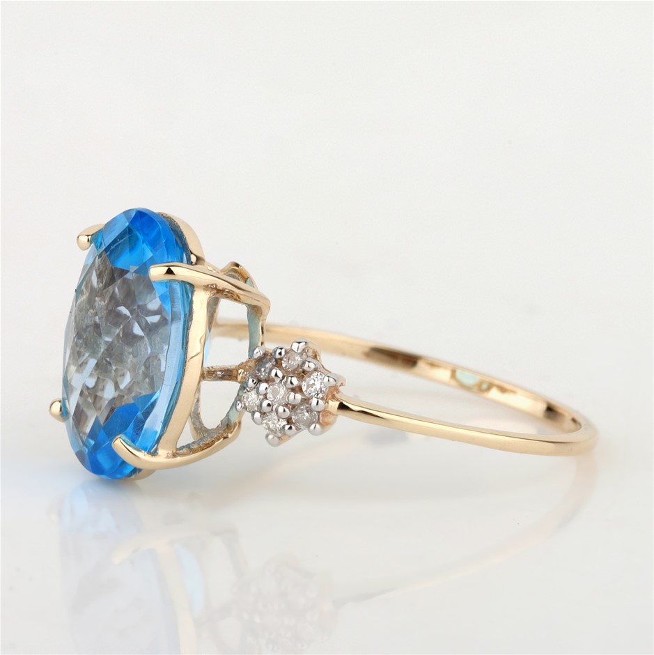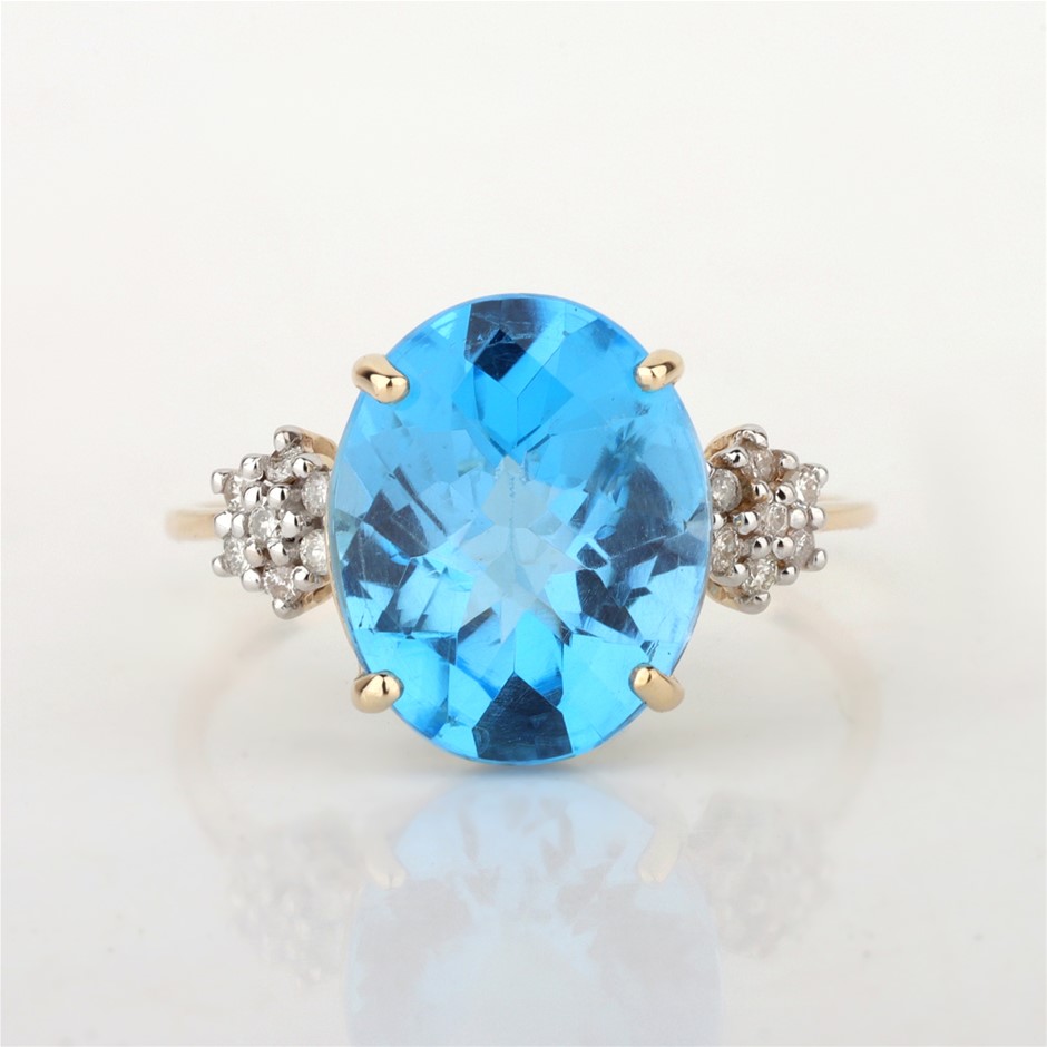 Yellow Gold Natural Swiss Blue Topaz & Diamond Ring with Valuation