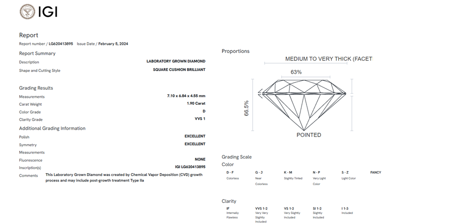 • 1.90 Carats D/VVS1 Lab Grown Diamond - IGI Certified