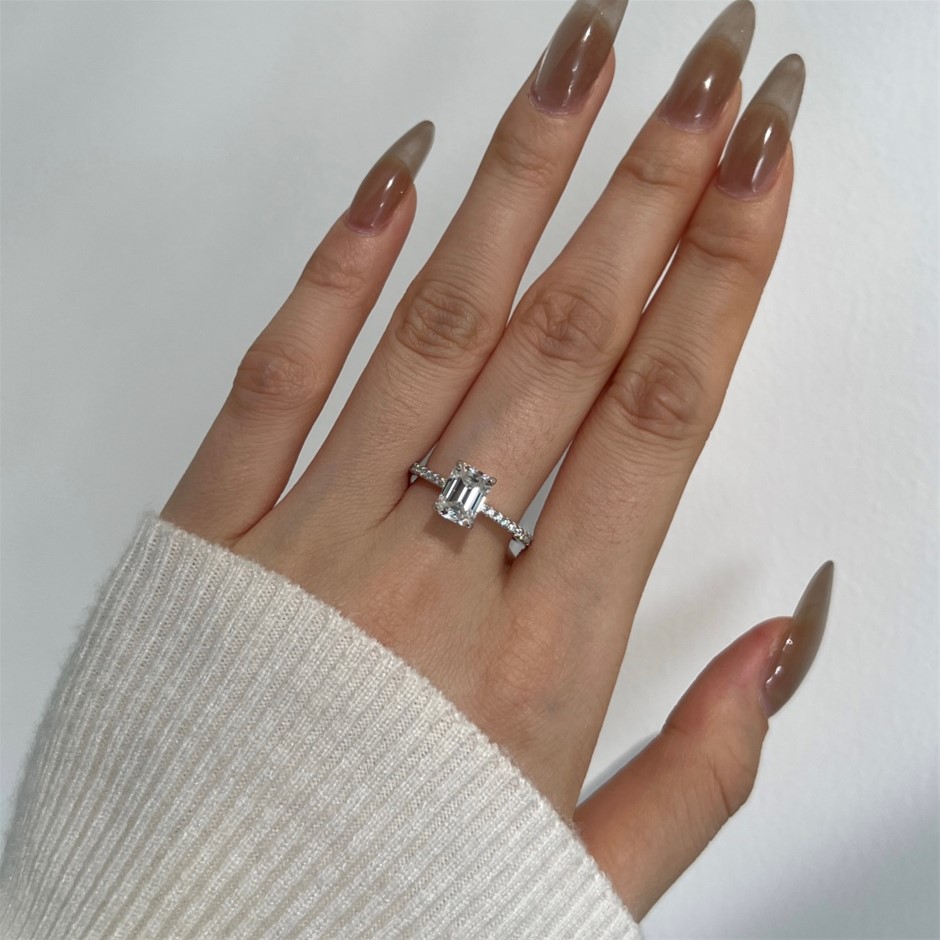 2.0ct Rectangle Cut GRA Certified Moissanite 925 Sterling Silver Ring - Size 9