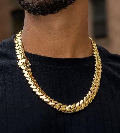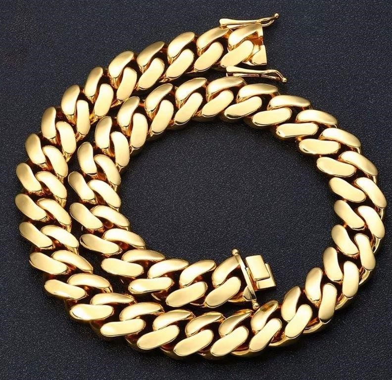18K/Italy Triple Solid Yellow Gold Plated Cuban Chain -55cm-14mm