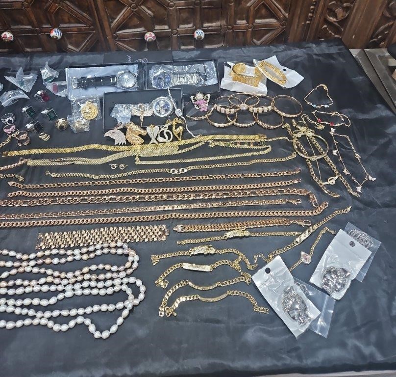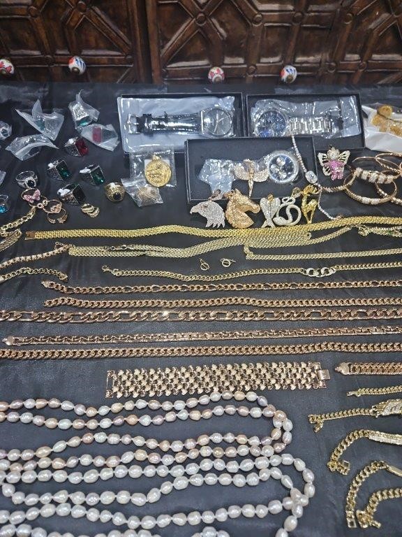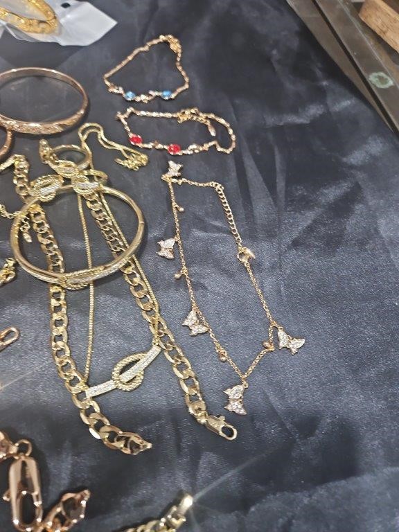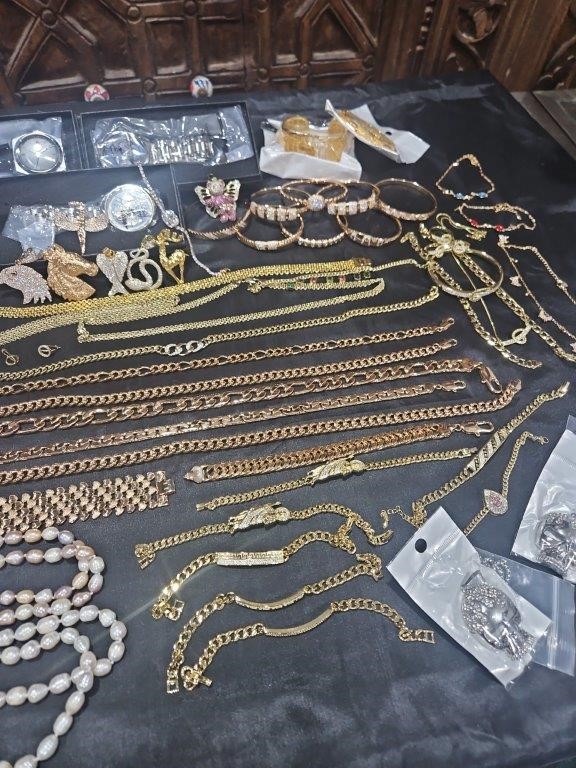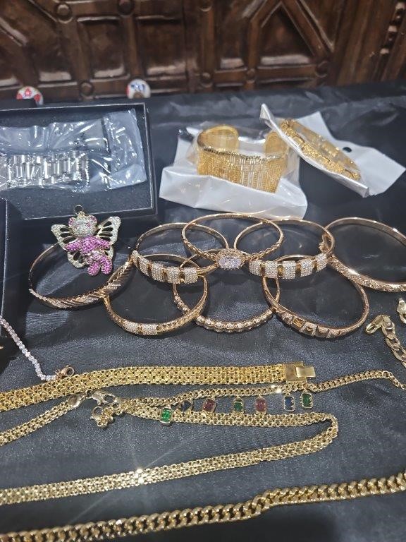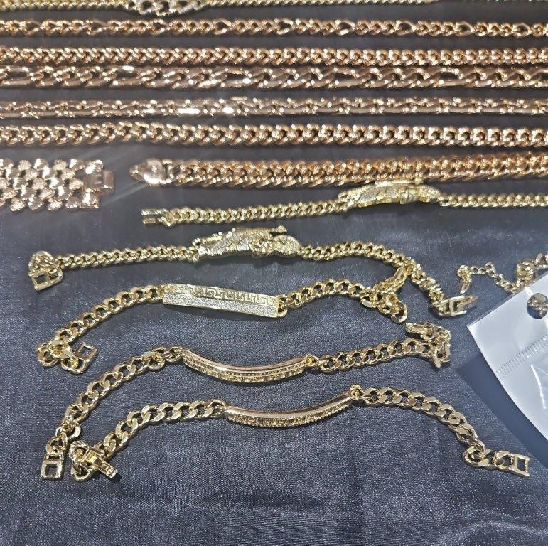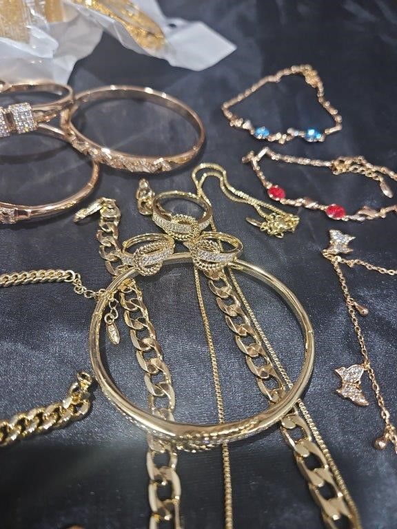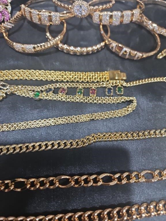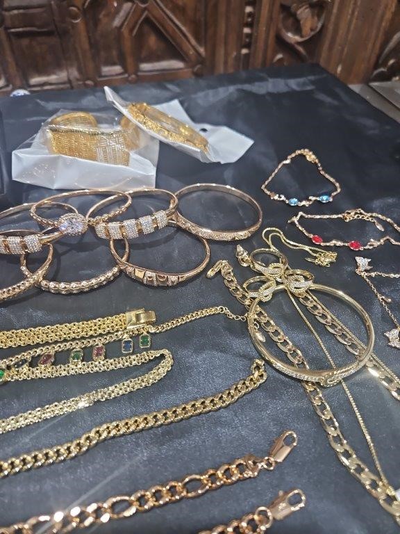• Detalis products: 1-19 pcs Bracelets with stamped 2- 16 pcs Chains sizes(45cm-50cm-55cm-60cm) Mix size with stamped. (18k/22k /s925 /Italy) 3- 1 pcs set Bangles and Rings with stamps (22kGold-Filled/italy) 4- 26pcs Men`s Rings 5- 2 pcs Set Pendants and chain with extra 925 silver chains with simulated diamonds stones. 6-9pcs Bangles with simulated diamonds 7-1 Set Earring & Ring & Necklace & Bangle 8- 7 pcs pendant with simulated diamonds and 18k stamps 9- 1 set Earring & Rings & necklace with PT950 stamps and simulated diamonds stones 10- 2 pcs Pearl Necklace (1.2m) 11- 4pcs x18k Earrings 12- 3watch with orginal boxes.